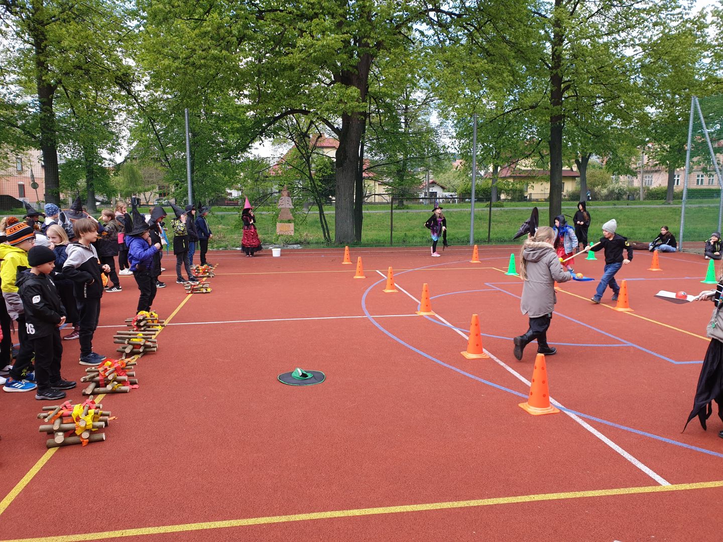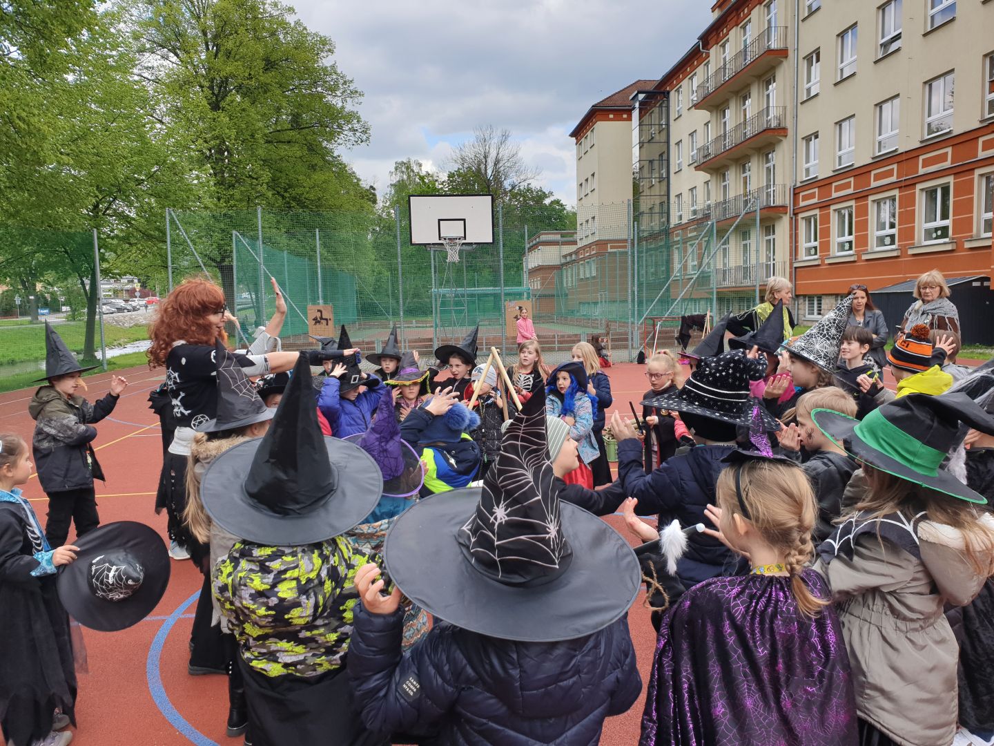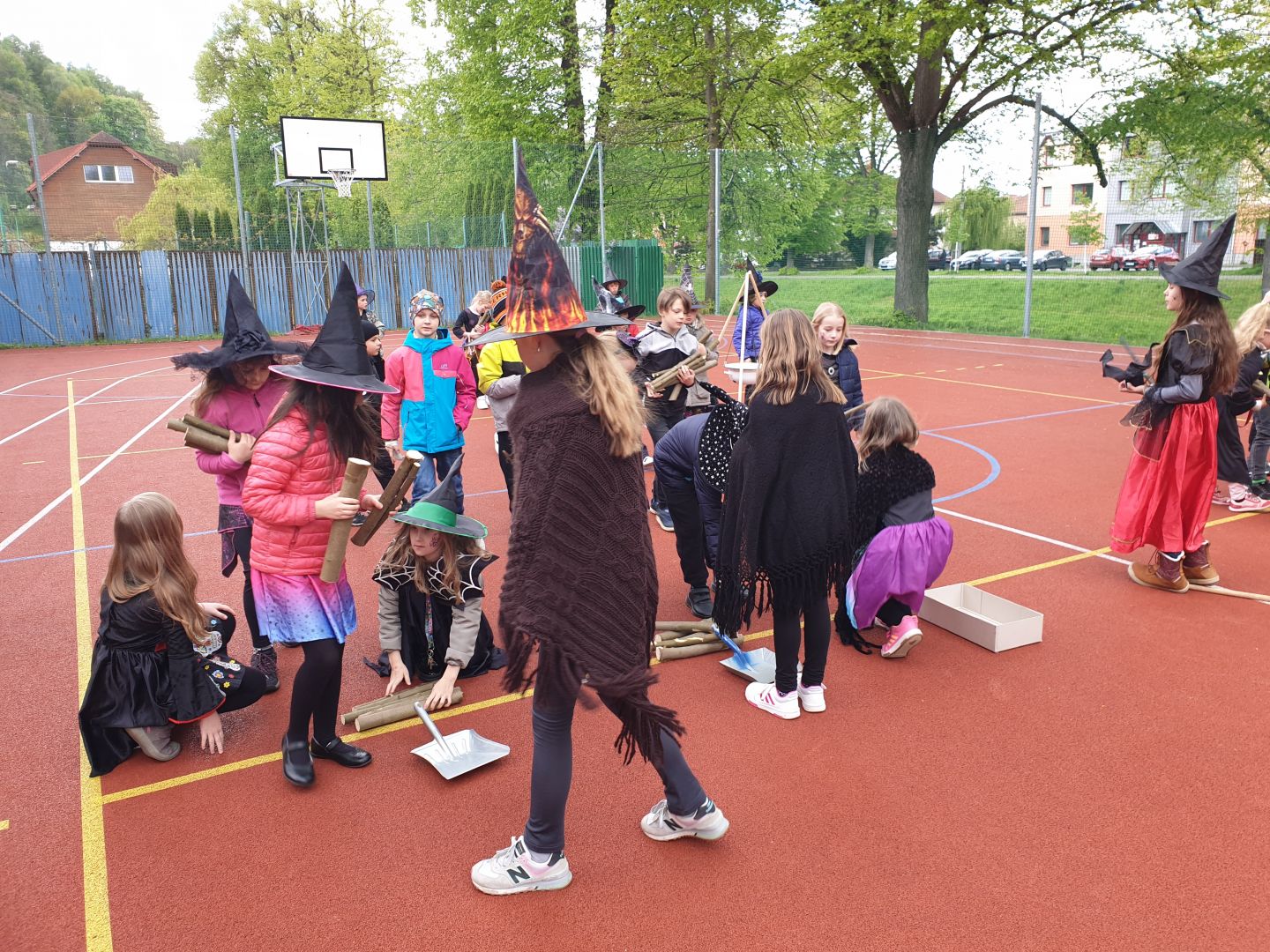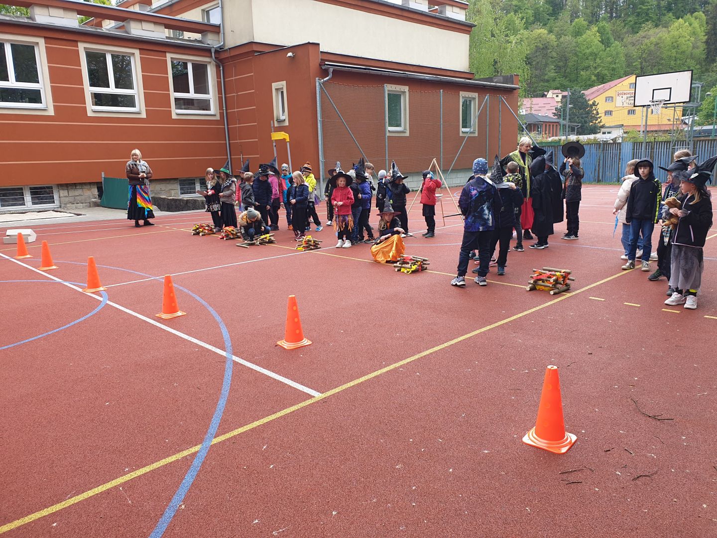 V pátek 26.4. se ve školní družině sletěly čarodějnice a mnoho jiných strašidelných bytostí. Potom na školním hřišti vypukl velký slet čarodějnic. Děti v maskách stavěly vatry, vyráběly čarodějný oheň, soutěžily v běhu s lopatou, v létání na koštěti a připravovaly čarodějný lektvar. Čarodějnické rejdění ukončil rituální tanec. Děti si rejdění užily a za splnění úkolů si odnesly čarodějnické vysvědčení s malou odměnou.