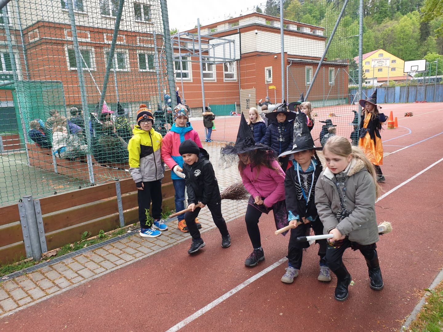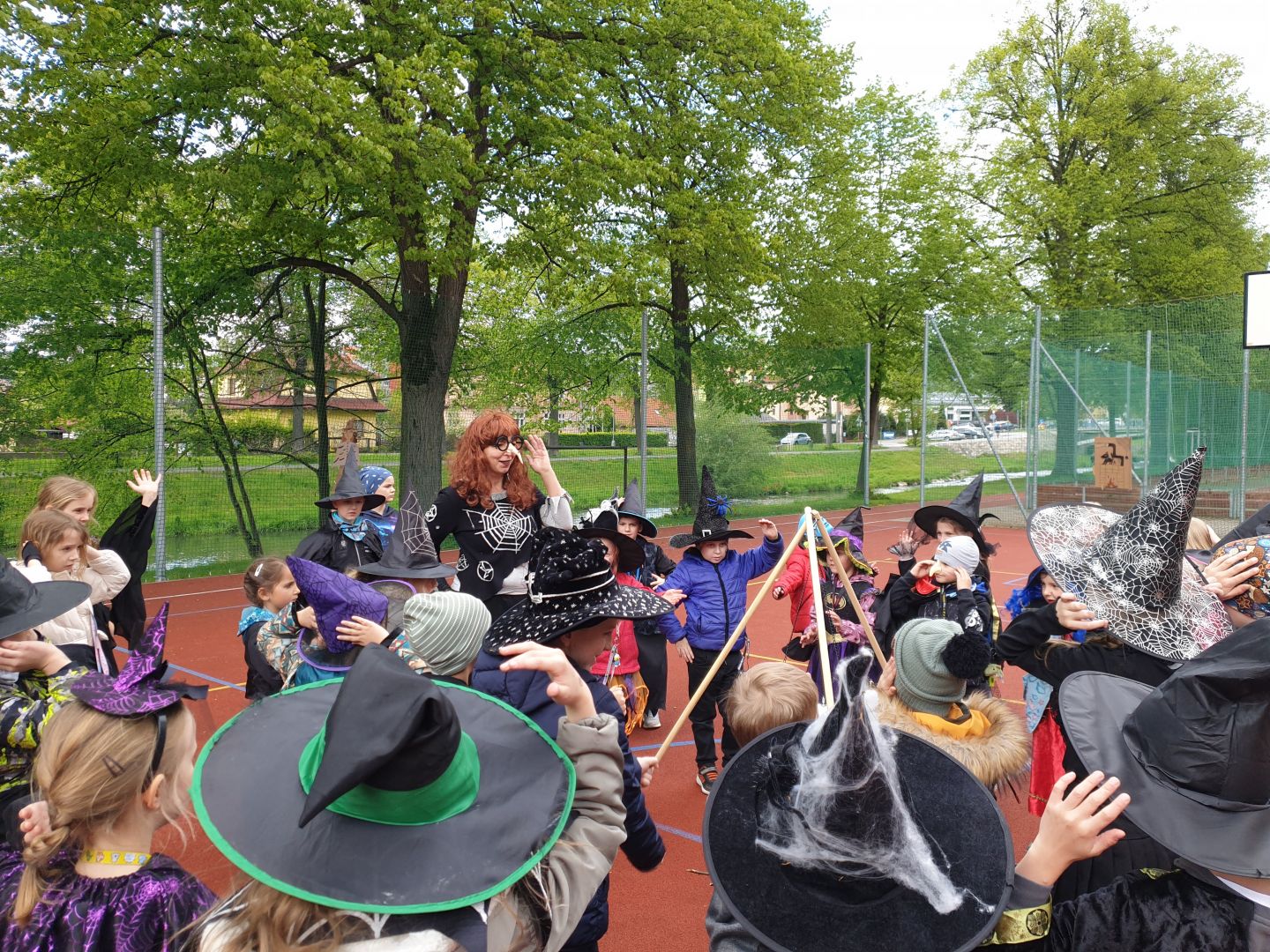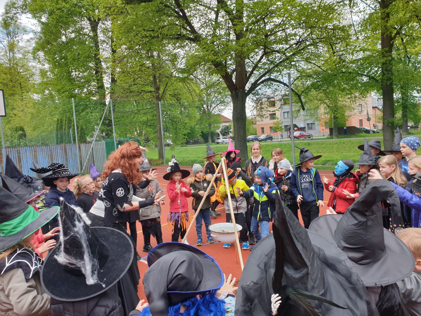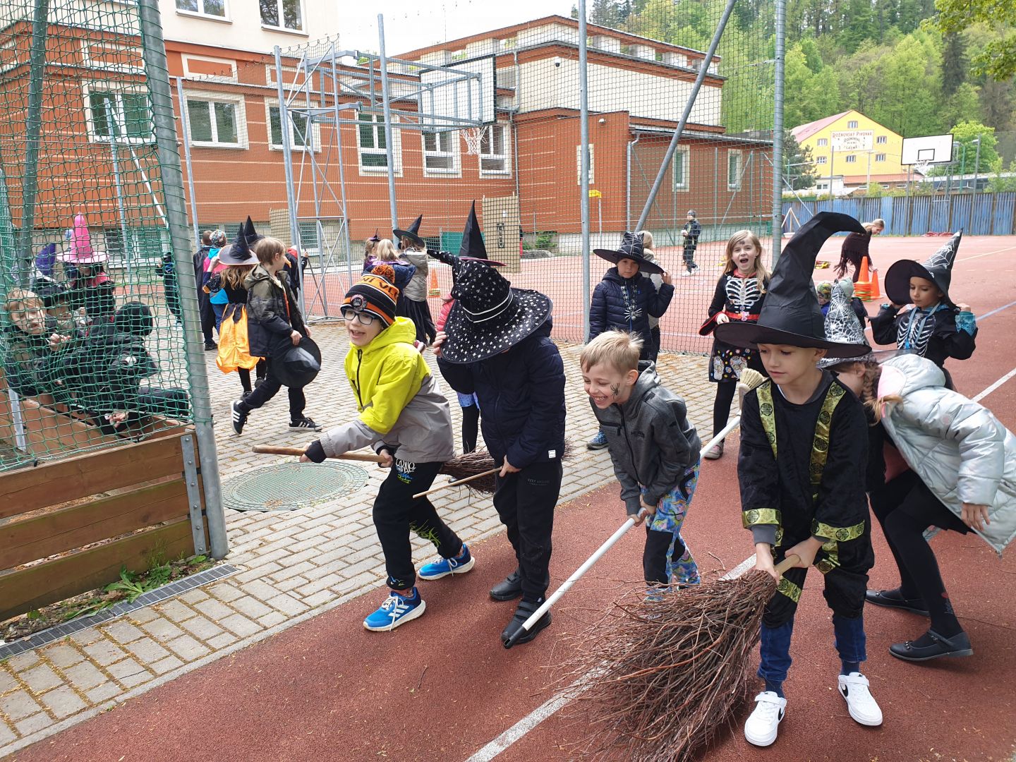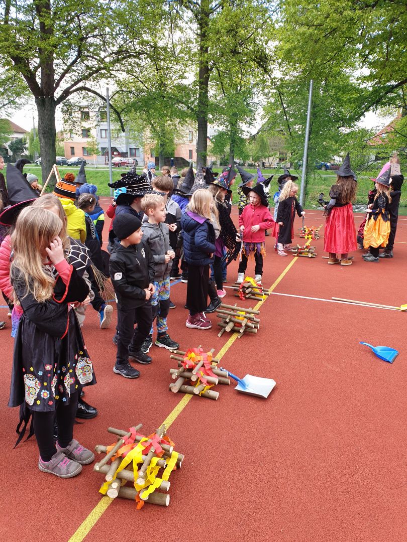 V pátek 26.4. se ve školní družině sletěly čarodějnice a mnoho jiných strašidelných bytostí. Potom na školním hřišti vypukl velký slet čarodějnic. Děti v maskách stavěly vatry, vyráběly čarodějný oheň, soutěžily v běhu s lopatou, v létání na koštěti a připravovaly čarodějný lektvar. Čarodějnické rejdění ukončil rituální tanec. Děti si rejdění užily a za splnění úkolů si odnesly čarodějnické vysvědčení s malou odměnou.