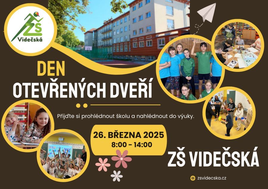 Zveme děti i rodiče na Den otevřených dveří ve středu 26. března 2025. Prohlédnete si školu a můžete nahlédnout do výuky na 1. i 2. stupni. Těšíme se na vás.