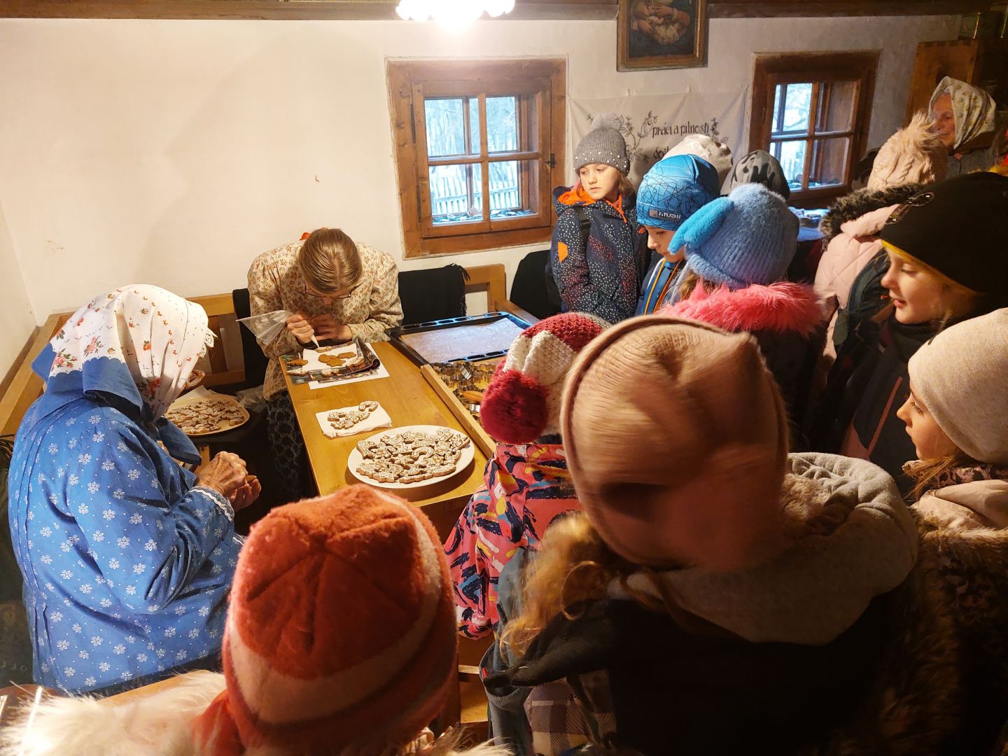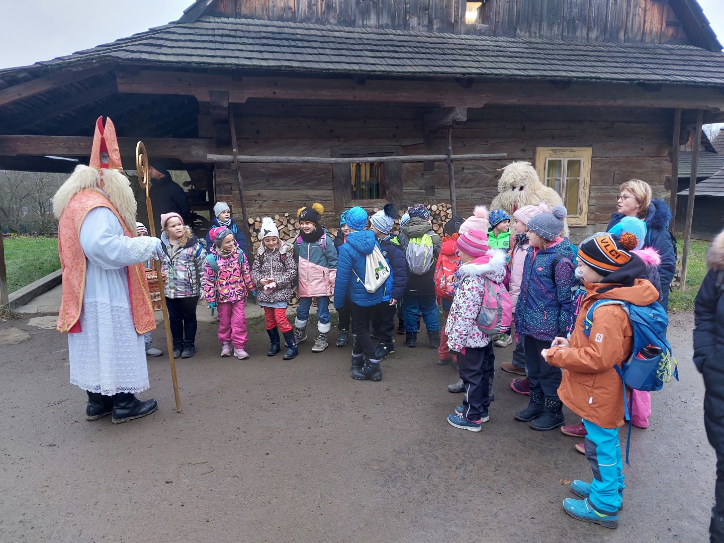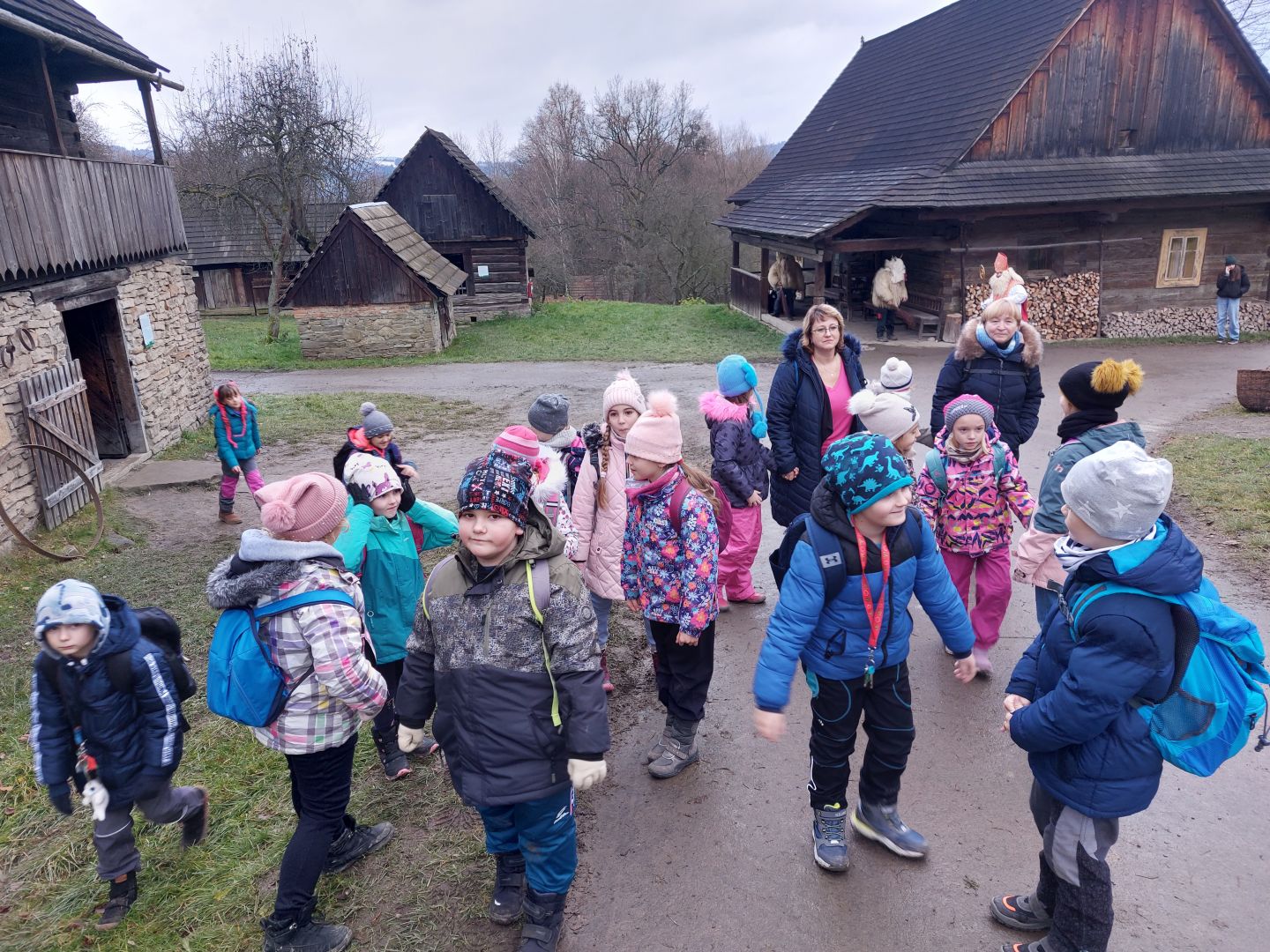 V pátek 9. 12. se druháci vydali do Valašského muzea v přírodě, abychom ještě více nasáli vánoční atmosféru a připomněli si, jak Vánoce slavili naši předci. V první chaloupce jsme viděli předení vlny na kolovrátku. V jiné se pekly voňavé perníčky z devíti koření. Po cestě dědinou nás postrašili čerti a Mikuláš nám rozdal sušené křížaly. Protože jsme mlsní, tak jsme šli ochutnat ještě sladké vánočkové pečivo a přitom jsme si zazpívali koledy s houslemi. Nakoukli jsme taky do kovárny. Protože jsou Vánoce plné zvyků, tradic a věštění, tak jsme odlévali olovo a pouštěli svíčky ve skořápkách. Nevynechali jsme ani starou školu. Potkali jsme taky Svatou Lucii, která z nás ometla všechno špatné a ukázali jsme si, jak se vyrábí svíčky ze včelího vosku. A na závěr, abychom se zahřáli a posilnili na cestu zpět do školy, jsme dostali teplý čaj a perník.