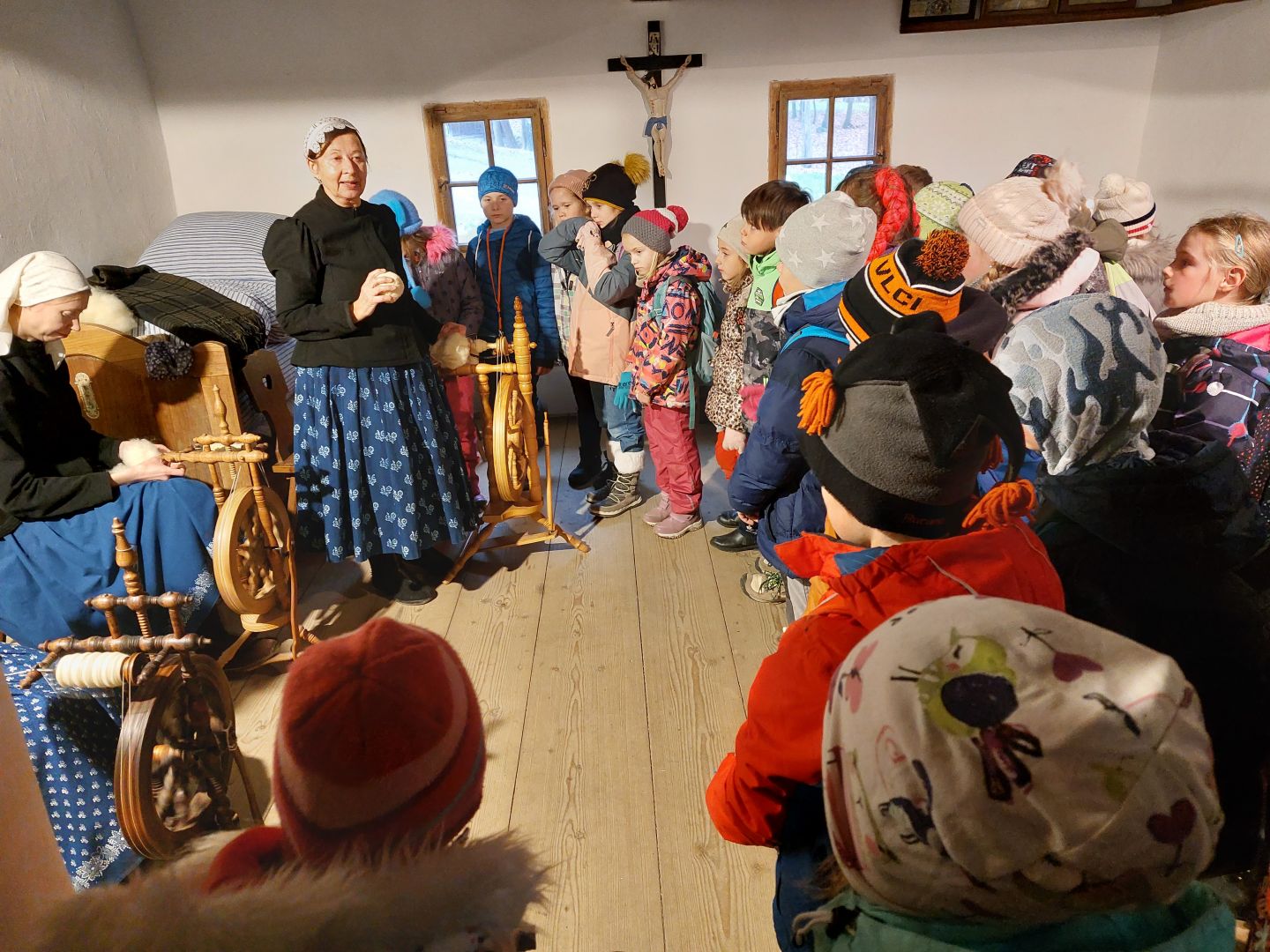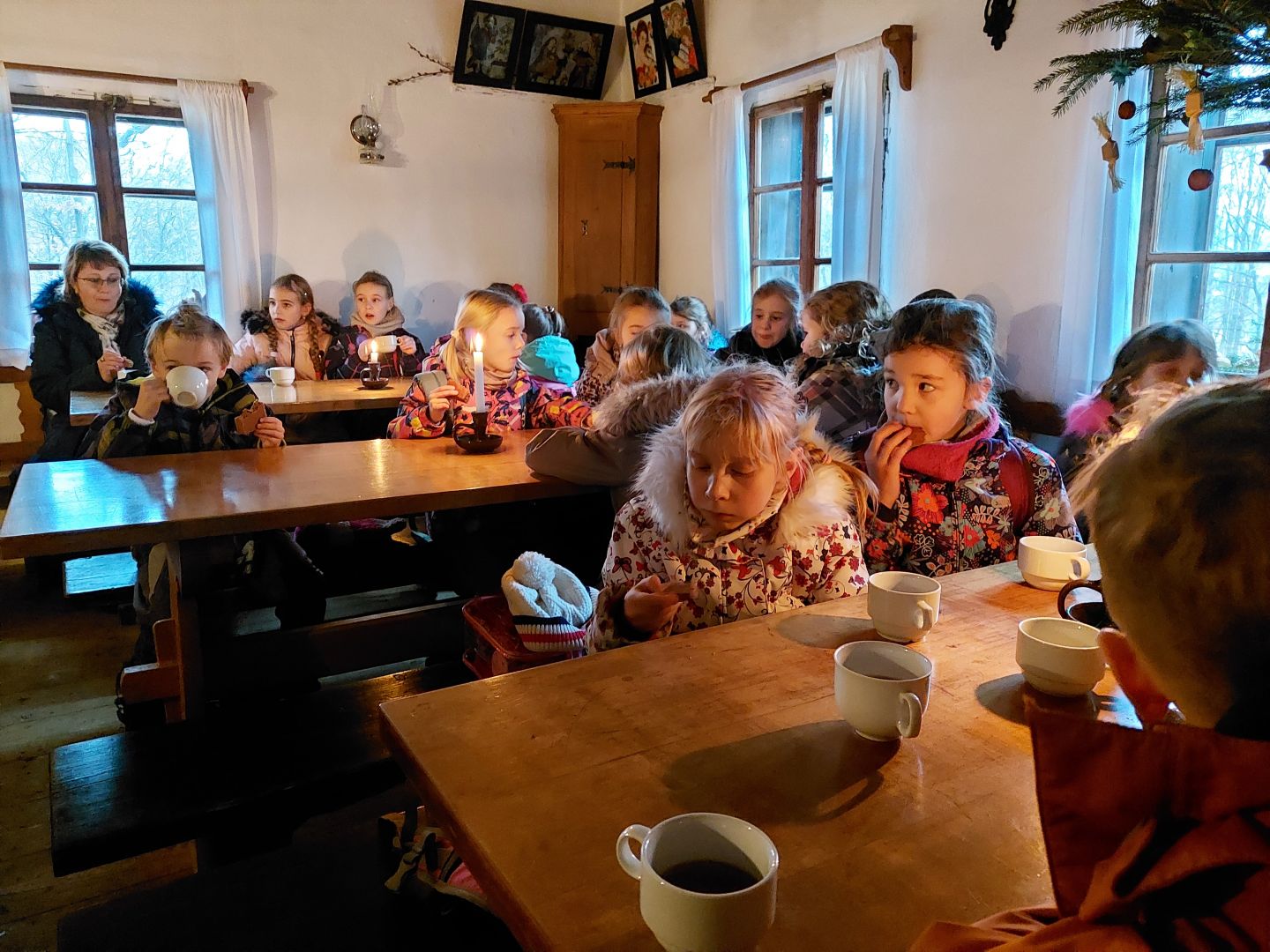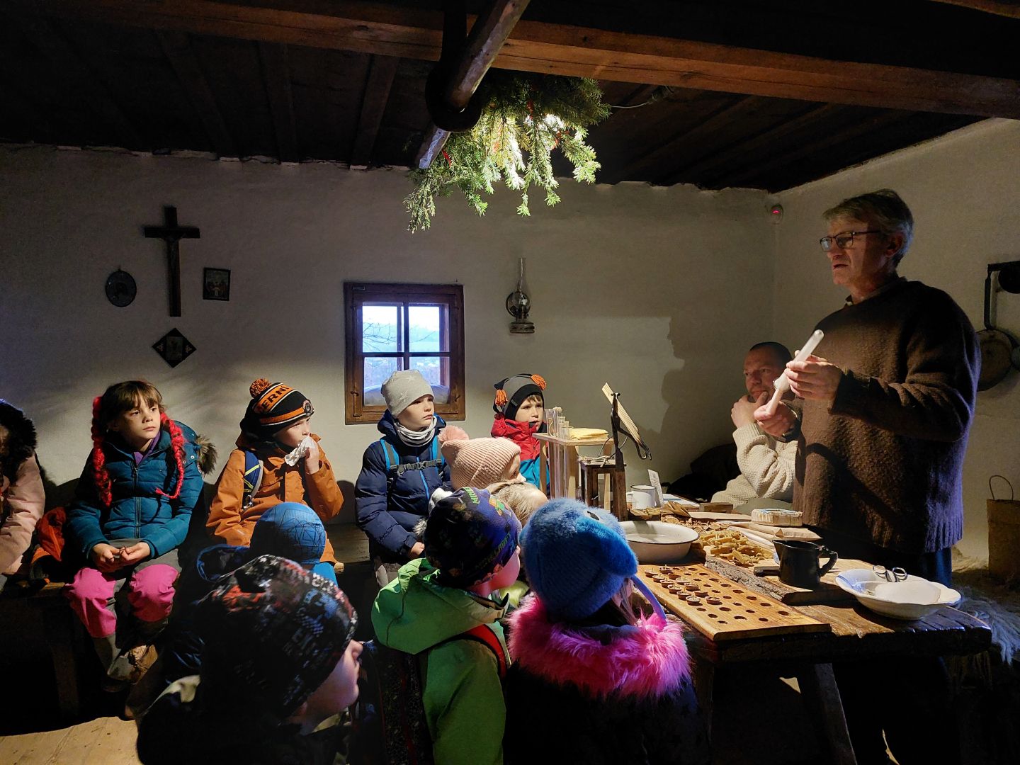V pátek 9. 12. se druháci vydali do Valašského muzea v přírodě, abychom ještě více nasáli vánoční atmosféru a připomněli si, jak Vánoce slavili naši předci. V první chaloupce jsme viděli předení vlny na kolovrátku. V jiné se pekly voňavé perníčky z devíti koření. Po cestě dědinou nás postrašili čerti a Mikuláš nám rozdal sušené křížaly. Protože jsme mlsní, tak jsme šli ochutnat ještě sladké vánočkové pečivo a přitom jsme si zazpívali koledy s houslemi. Nakoukli jsme taky do kovárny. Protože jsou Vánoce plné zvyků, tradic a věštění, tak jsme odlévali olovo a pouštěli svíčky ve skořápkách. Nevynechali jsme ani starou školu. Potkali jsme taky Svatou Lucii, která z nás ometla všechno špatné a ukázali jsme si, jak se vyrábí svíčky ze včelího vosku. A na závěr, abychom se zahřáli a posilnili na cestu zpět do školy, jsme dostali teplý čaj a perník.
