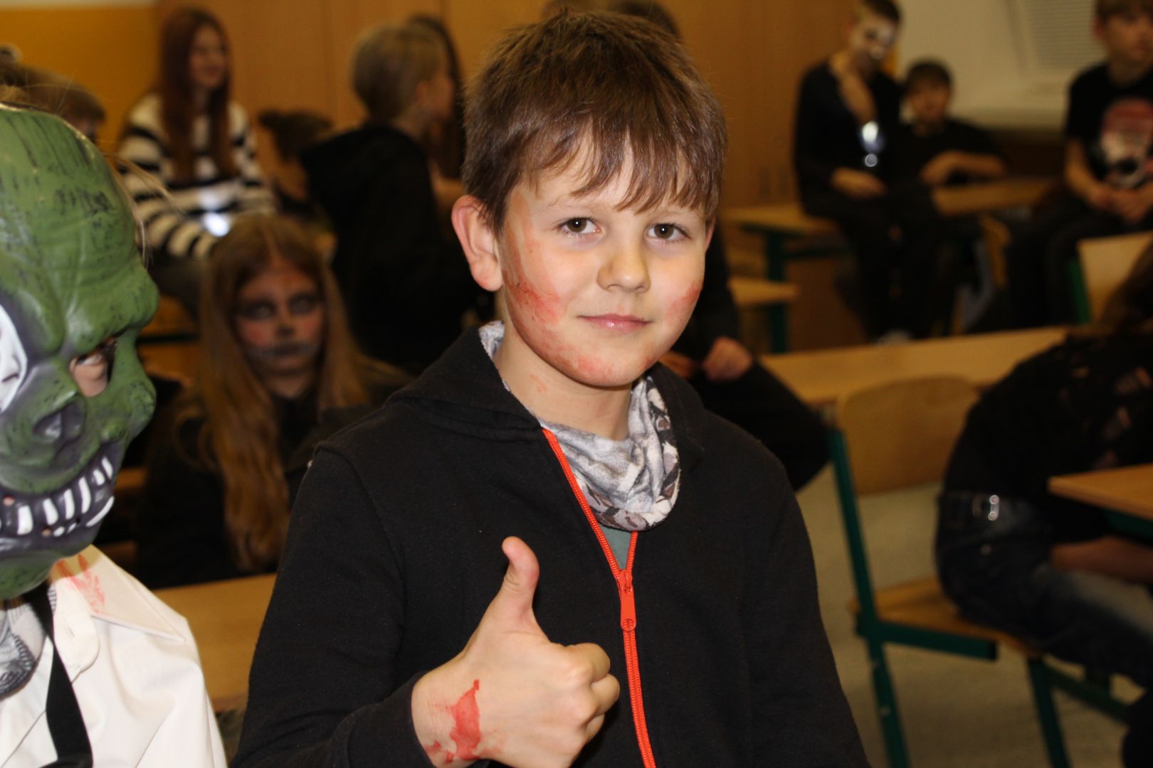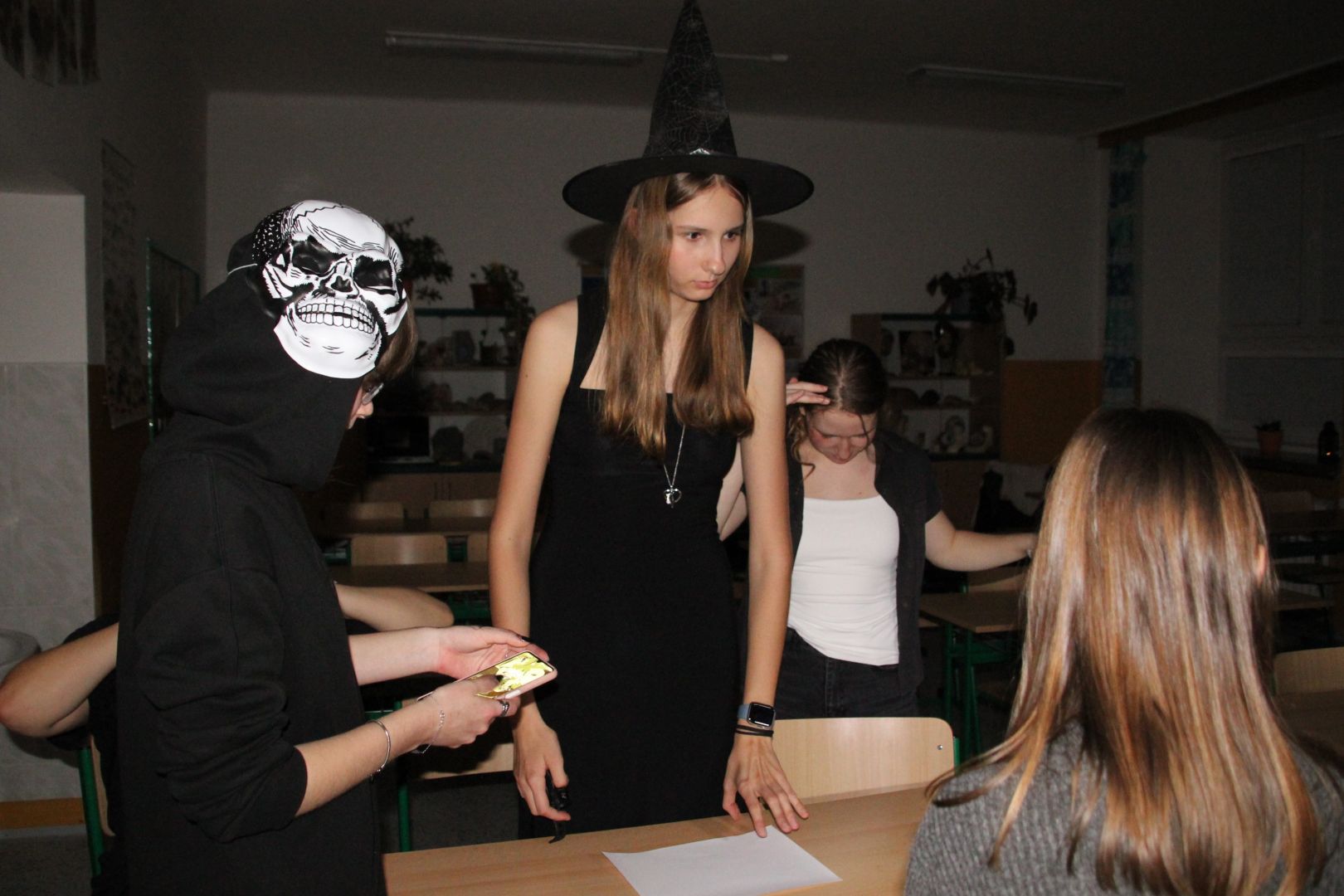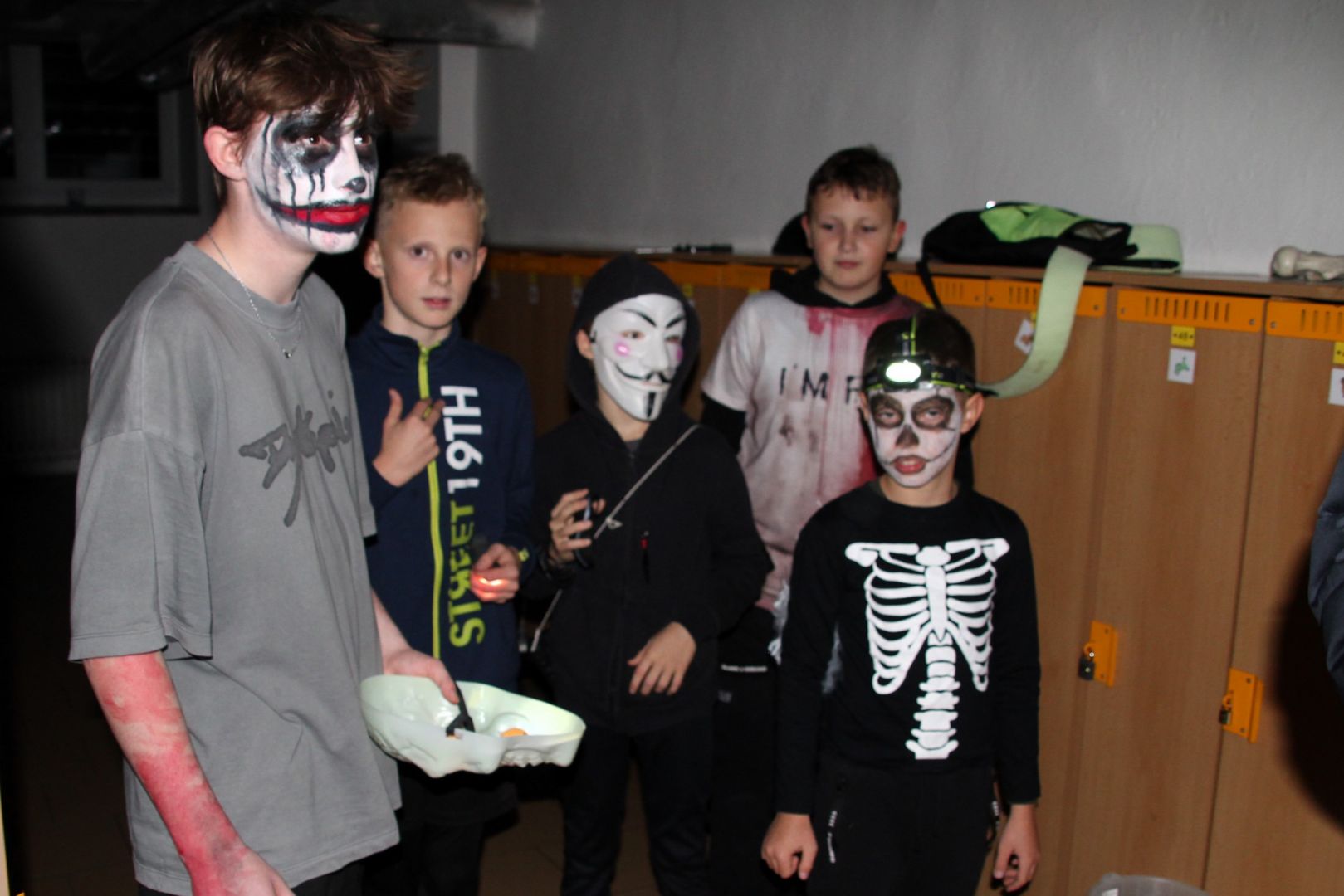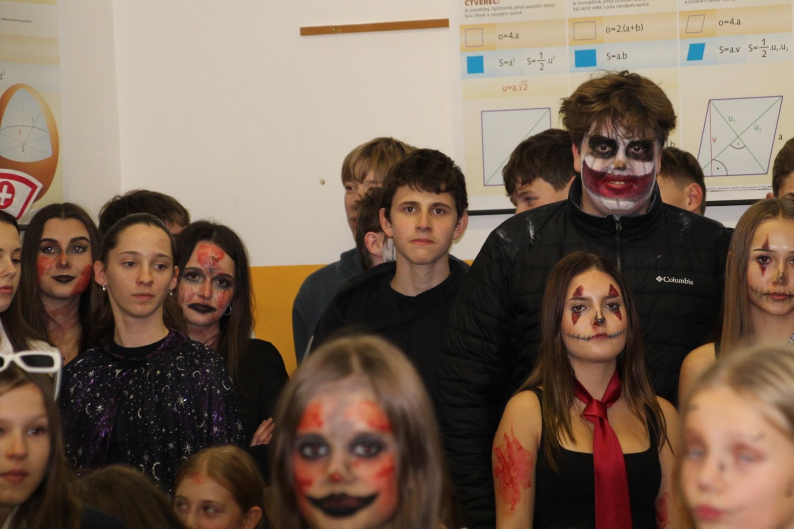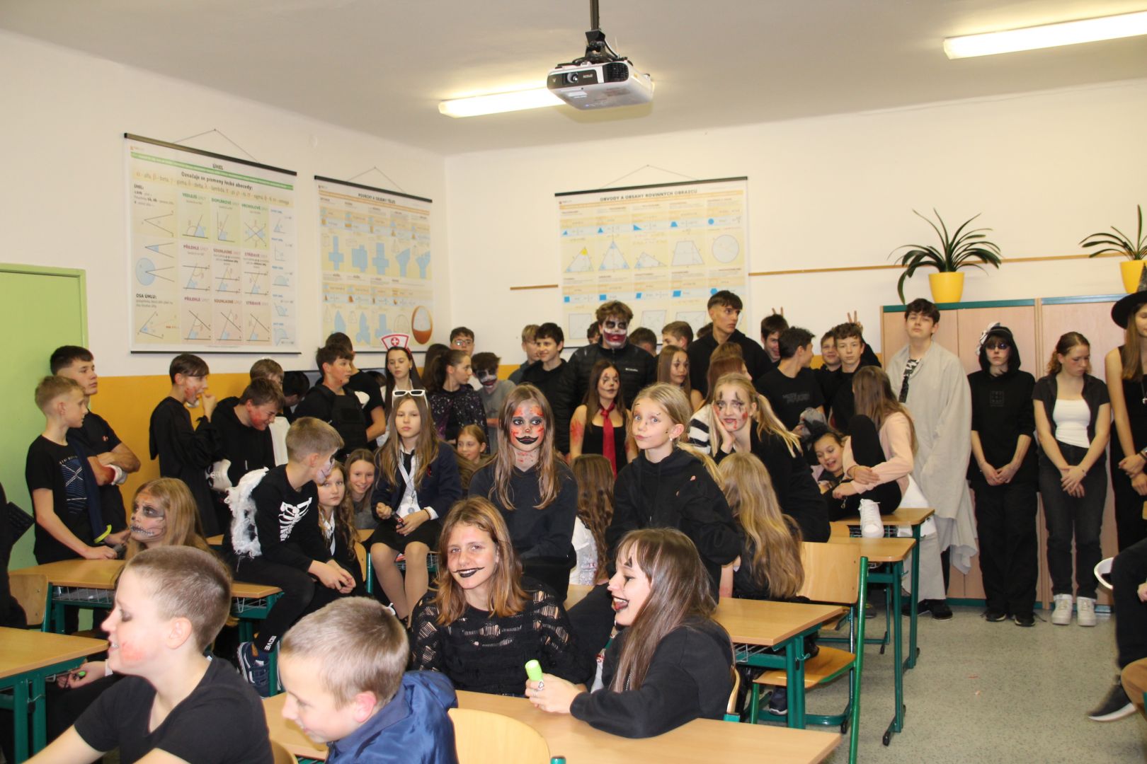Ve čtvrtek 7. listopadu probíhala v naší škole Halloweenská party, kterou pořádali pro žáky 6. tříd deváťáci a učitelé AJ. Vše se odehrálo potmě, začínali jsme v 17 hodin. Nejprve učitelé připomněli pravidla a rozdali nám soutěžní kartičky, byli jsme v týmech po čtyřech. Pak jsme začali chodit po stanovištích. Většina z nich byla v učebnách, dvě byla v podsvětí (v šatně) a jedno v relax timu. Nejvíce se mi líbila 3 stanoviště: řeznictví, kde jsme hledali prasátko, které řezníkům uteklo, vyšetřování vraždy jako policajti a také hádání hororových filmů. Za splněné úkoly jsme dostali body. Když všechny týmy obešly všechna stanoviště, nastalo vyhlášení. Náš tým zvítězil. Dostali jsme diplom a velké halloweenské lízátko. Muffinem a bonbóny byli odměněni všichni. Akce se mi strašně moc líbila a cením práci deváťáků.