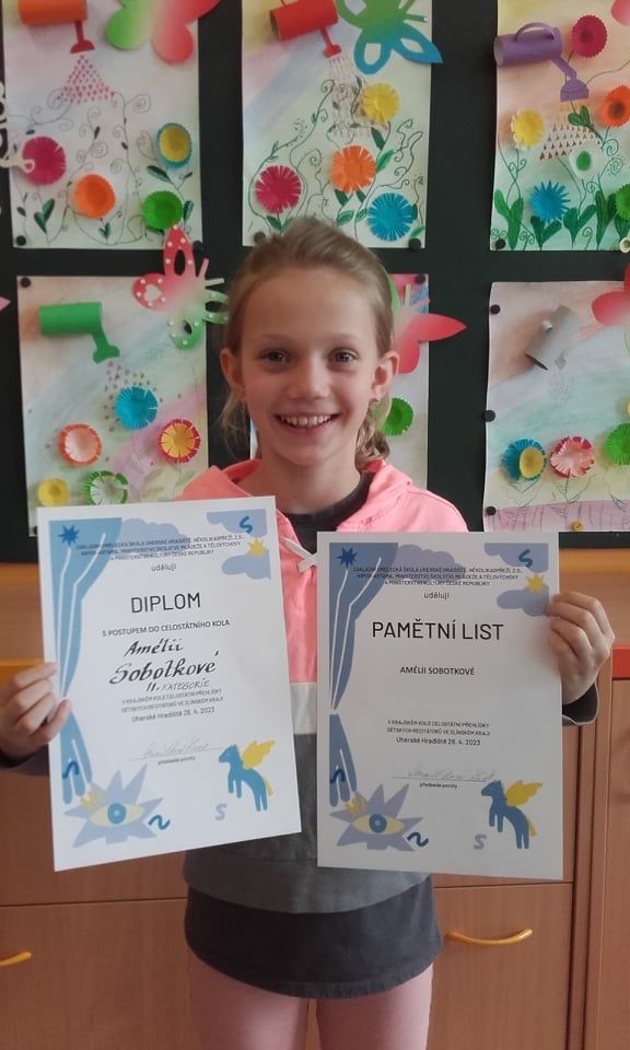 Dne 28. dubna 2023 se v Uherském Hradišti konalo krajské kolo recitační soutěže. Naši školu reprezentovala dvě děvčata - Amélie Sobotková ze třídy 4. A a Kristýna Toflová ze třídy 8.A. Amélka s básní ,,Monika, co chtěla poníka" svoji kategorii vyhrála a zajistila si tak postup do celostátního kola, které se koná v červnu ve Svitavách. Moc blahopřejeme a budeme držet pěstičky. Kristýna předvedla skvělý recitační výkon, za který jí patří velká pochvala. Děkujeme děvčatům za vzornou reprezentaci školy.