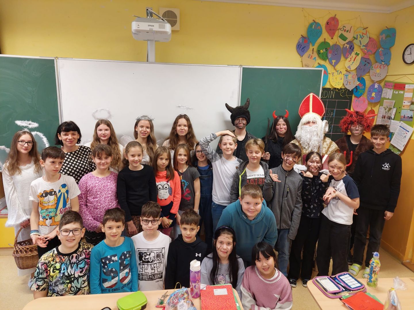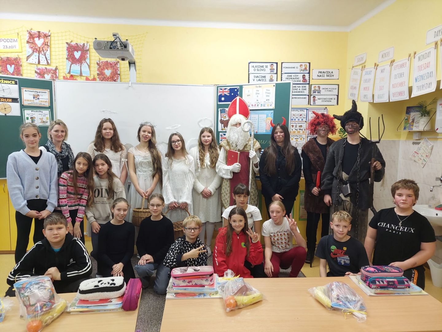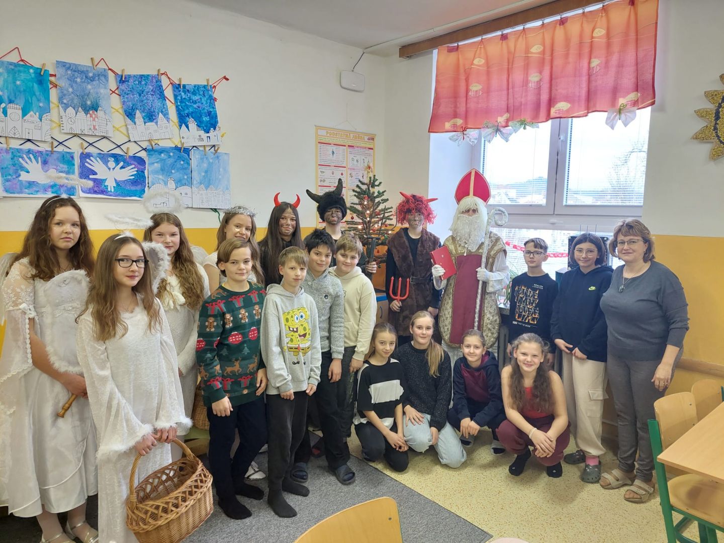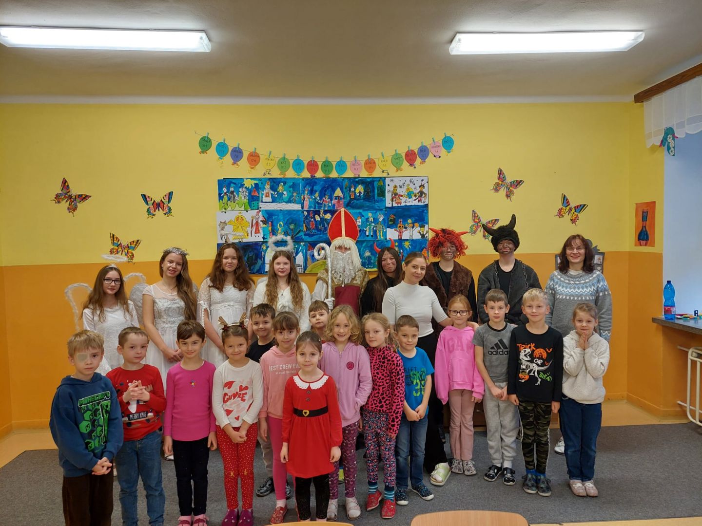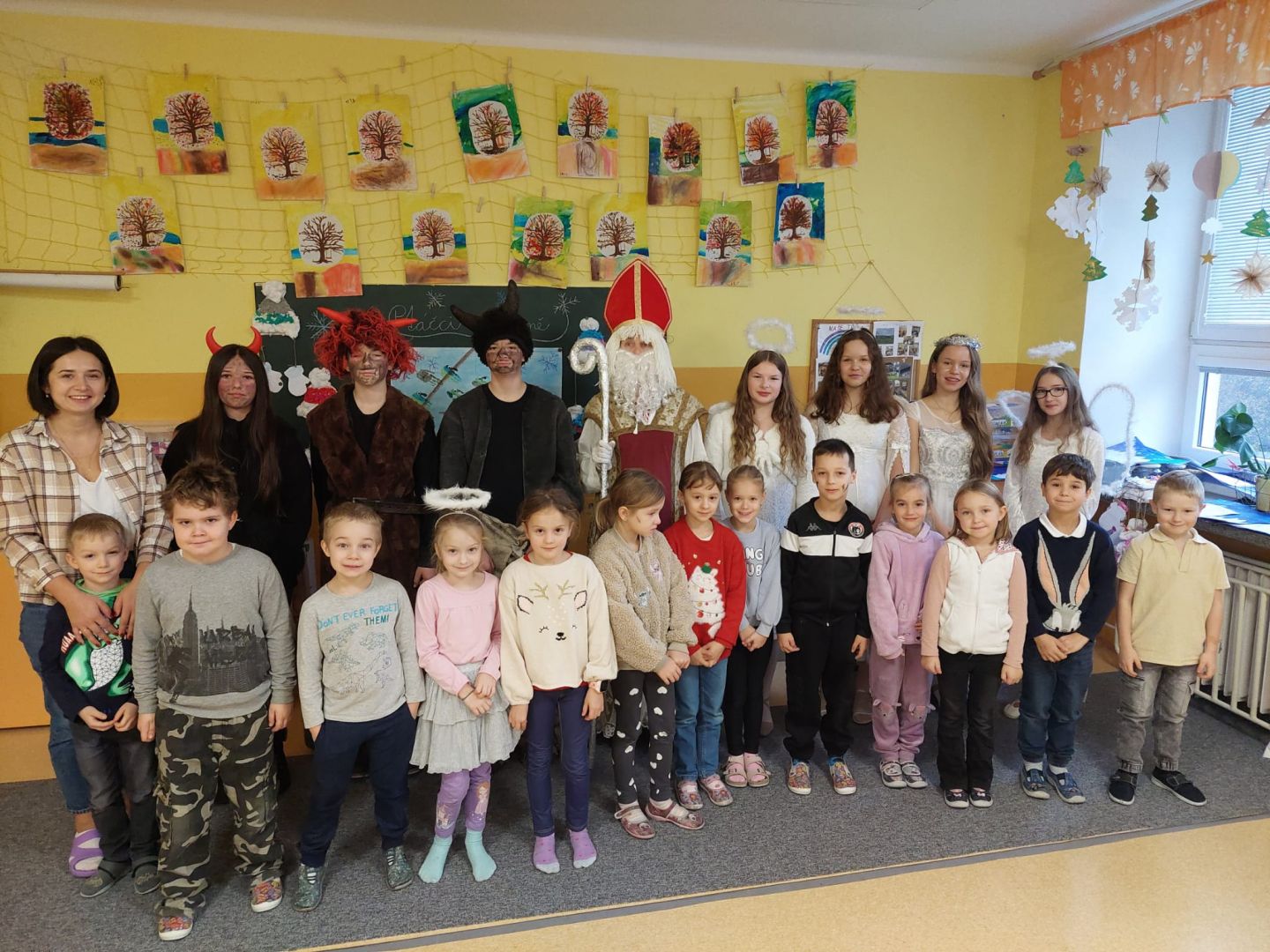 Mikuláš spolu se svojí družinou andělů a čertů navštívil děti z prvního stupně letos poprvé na dvou místech najednou. Jedním místem byly tradičně třídy, kam zavítala tato ,,nebesko-pekelná skupina“ za těmi nejmenšími žáky naší přípravné třídy, prvňáčky a také k těm nejstarším žákům prvního stupně, tedy čtvrťákům a páťákům. Ti si vyslechli Mikulášovu zprávu z nebes o práci jednotlivců i celé ,,party“, zazpívali koledu, či jinou vánoční písničku, a dostali za odměnu krásný zdravý balíček plný mrazem sušených jahod a čerstvého ovoce.