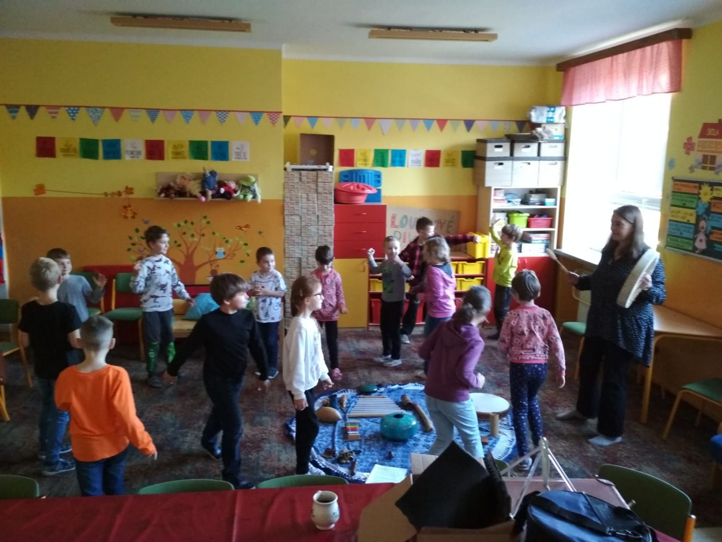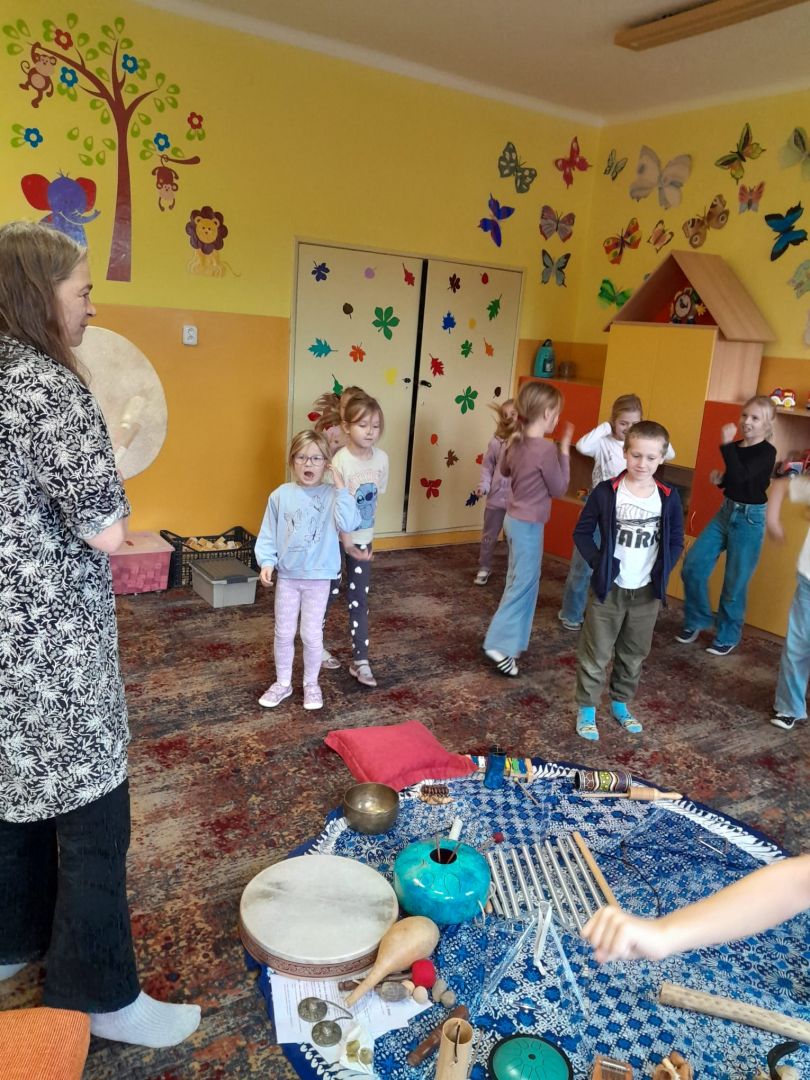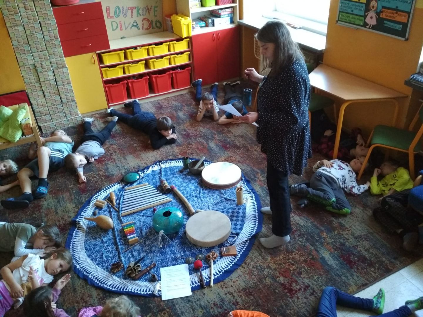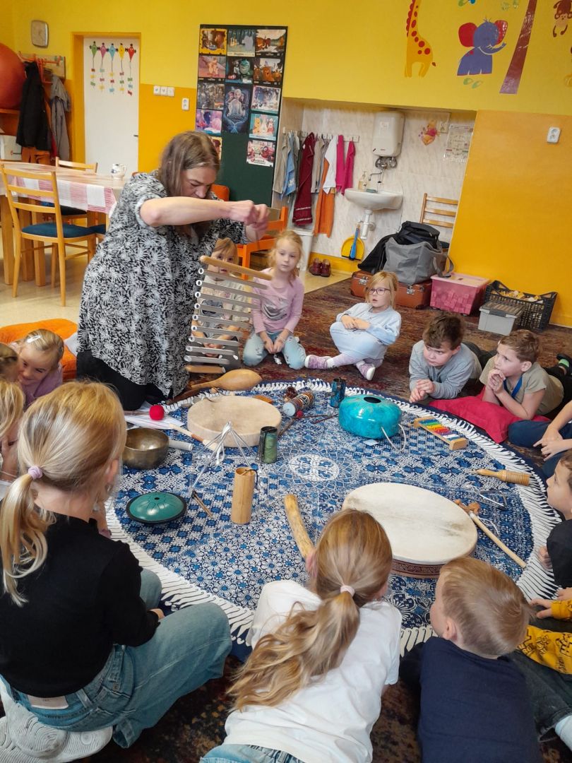 Děti se s nimi seznámily a aktivně si na ně zahrály. Vyzkoušely si například různé druhy bubnů (šamanský, mořský, hromový a různé kovové), dešťovou hůl, rozmanitá chrastítka z přírodnin, kalimbu nebo zvonkohry.