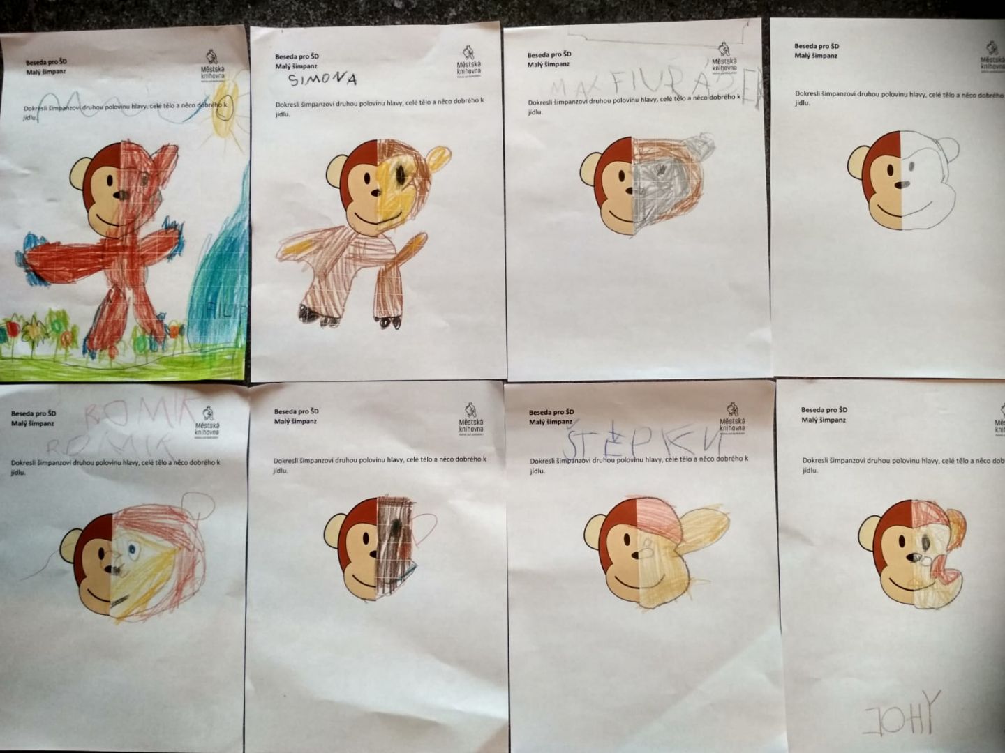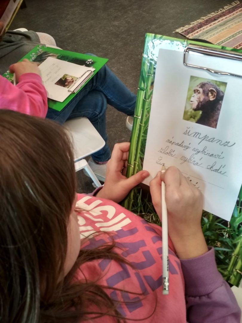 V průběhu minulého týdne, všechny třídy ŠD, postupně navštívily městskou knihovnu. Děti se dozvěděly mnoho zajímavých informací o malém šimpanzovi a jeho rodině. Plnily úkoly, kreslily a hrály hry.