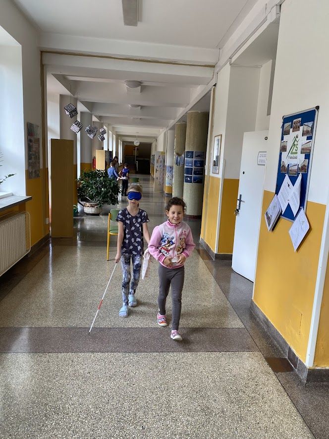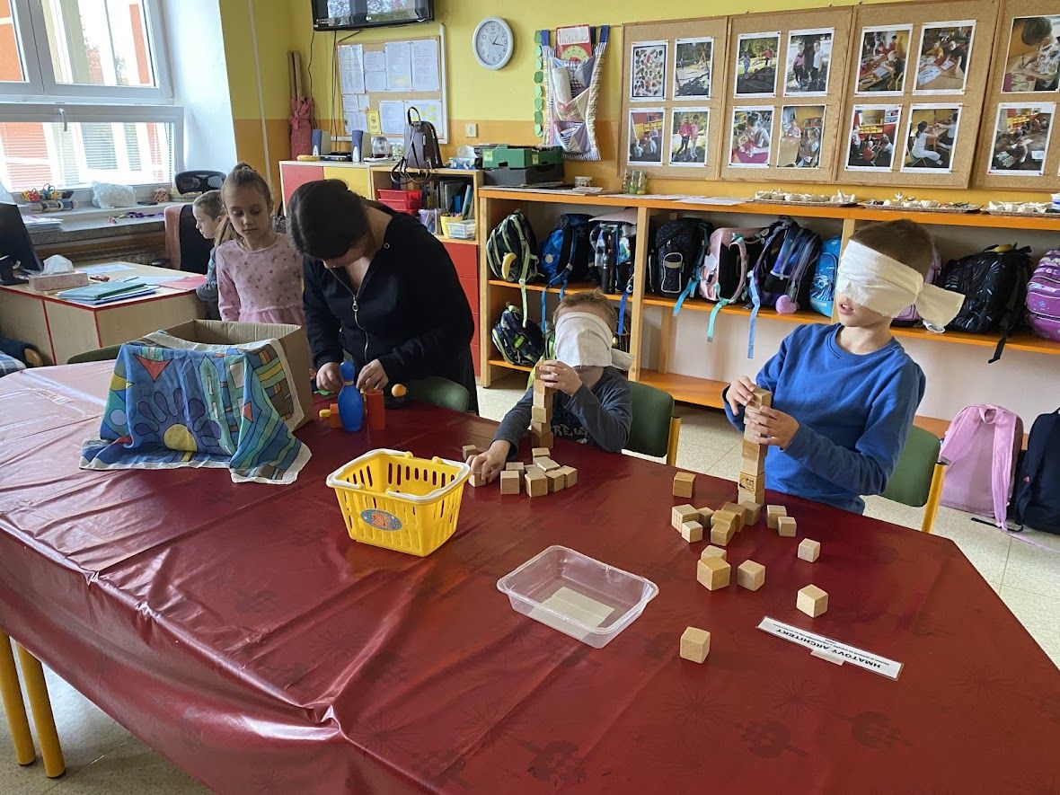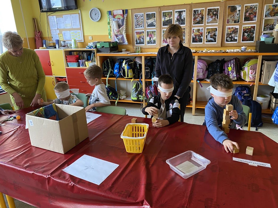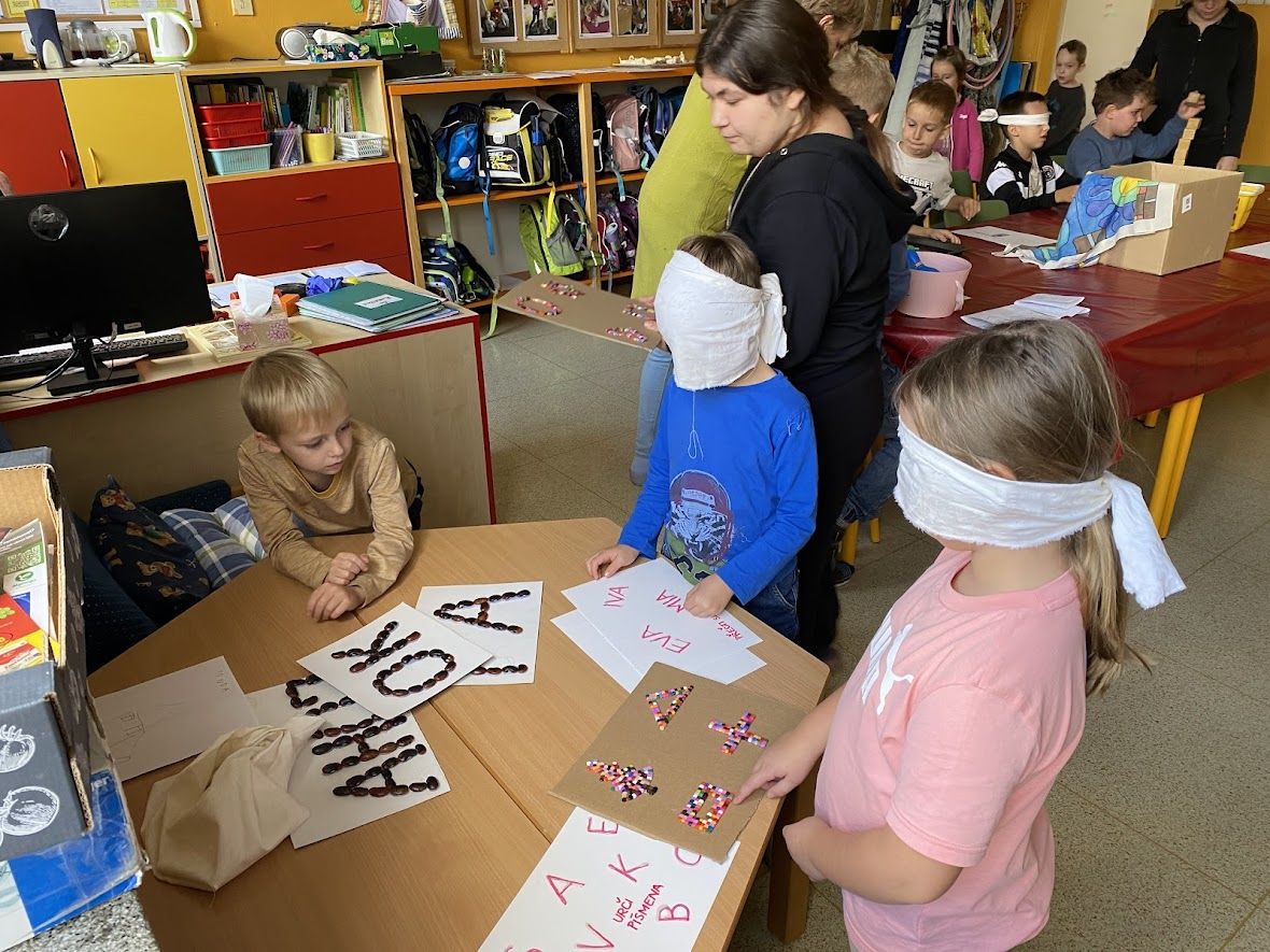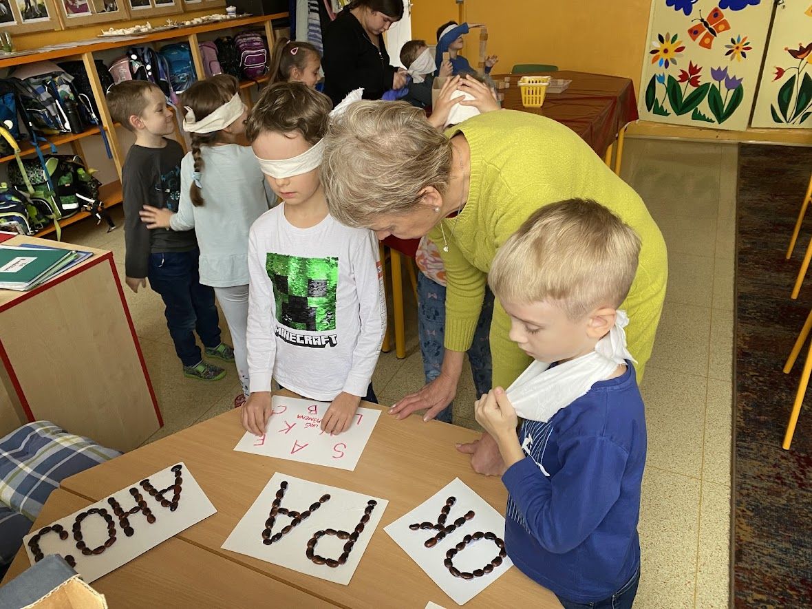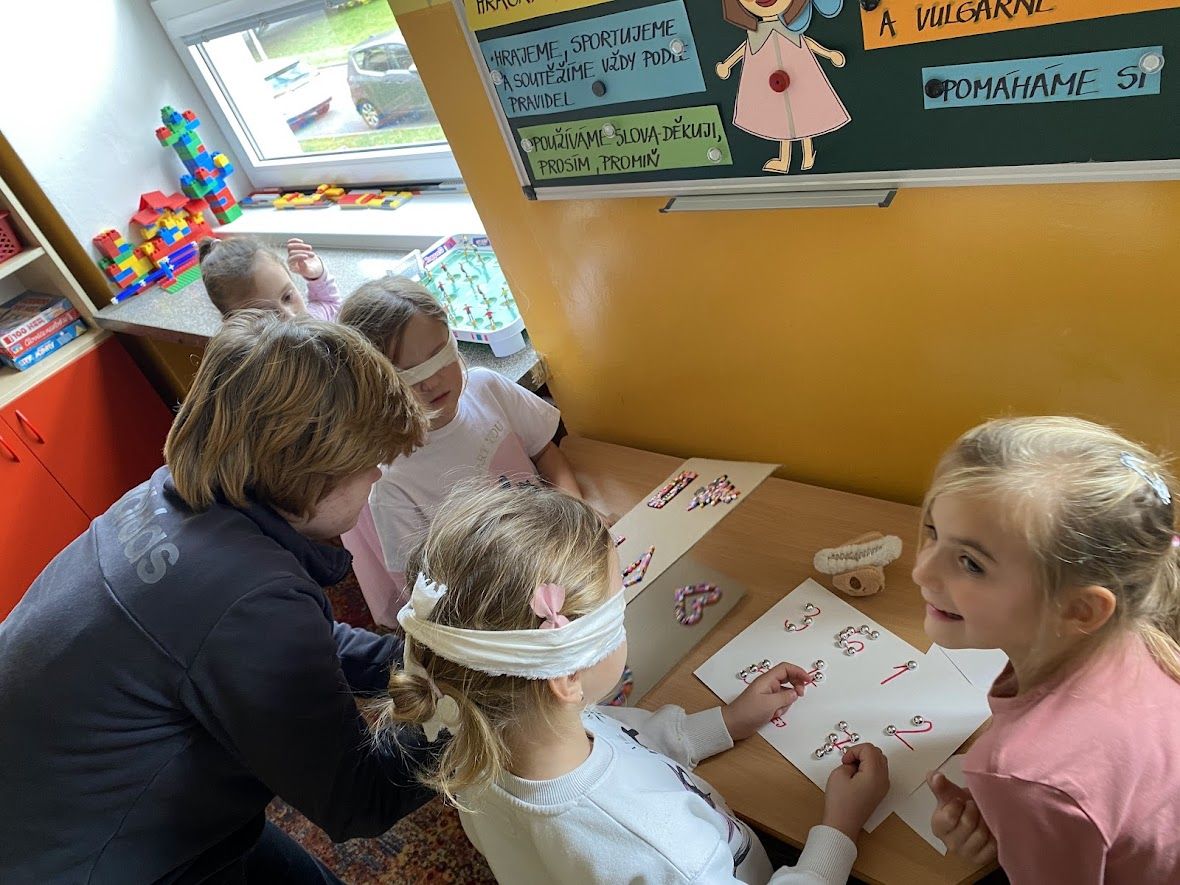 Poznávaly předměty, potraviny a vůně se zavázanýma očima, četly a kreslily poslepu, procvičovaly vzájemnou důvěru ve dvojicích a nacvičovaly pohyb s bílou holí a "vodícím psem".