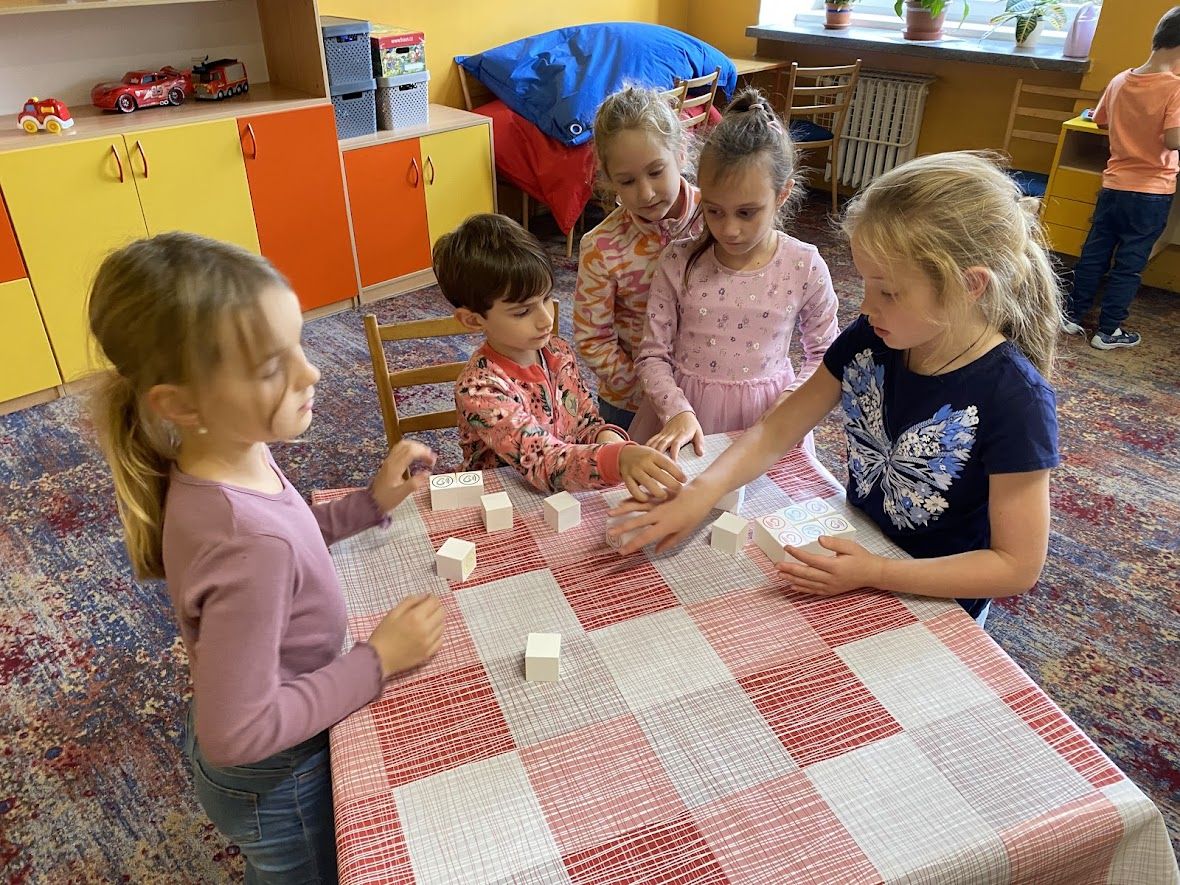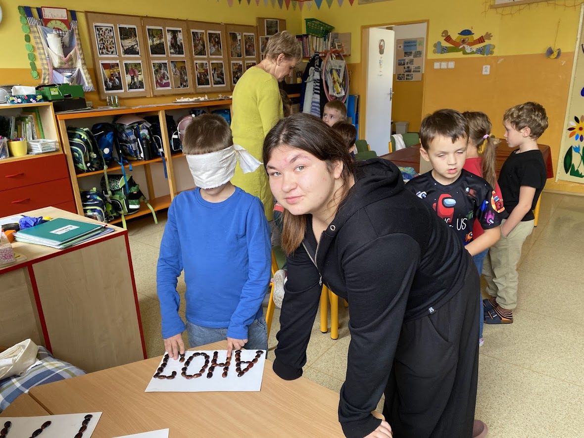 Velké poděkování patří našim patronům z 9.A (Kateřina Konečná, Beata Barabášová, Leona Valchářová a Tereza Šulganová) a z 9.B (Eliška Rajnochová a Ljuba Malynovská) za pomoc s dětmi.