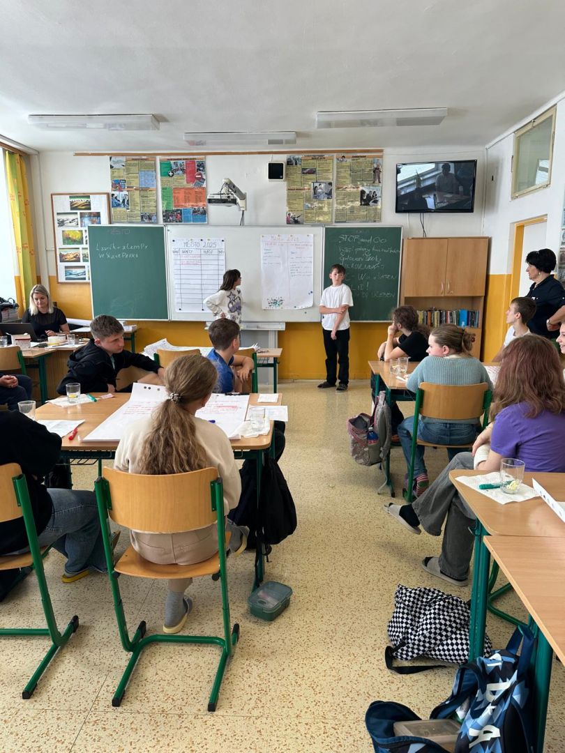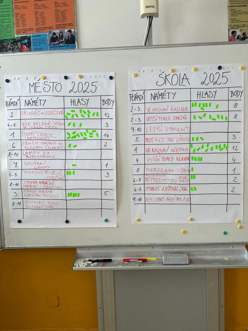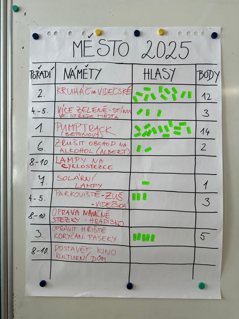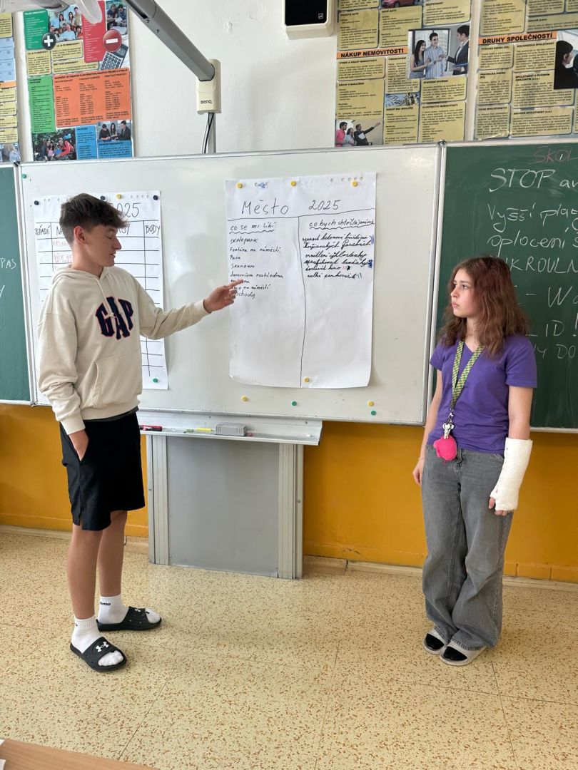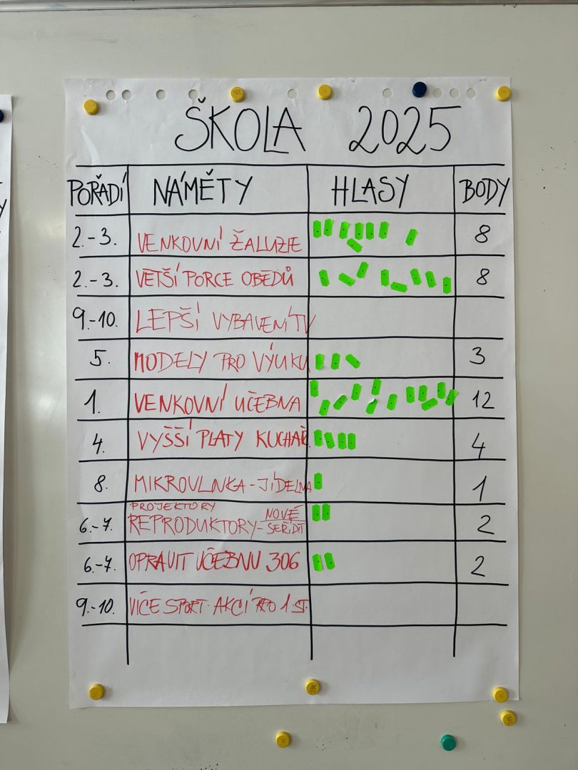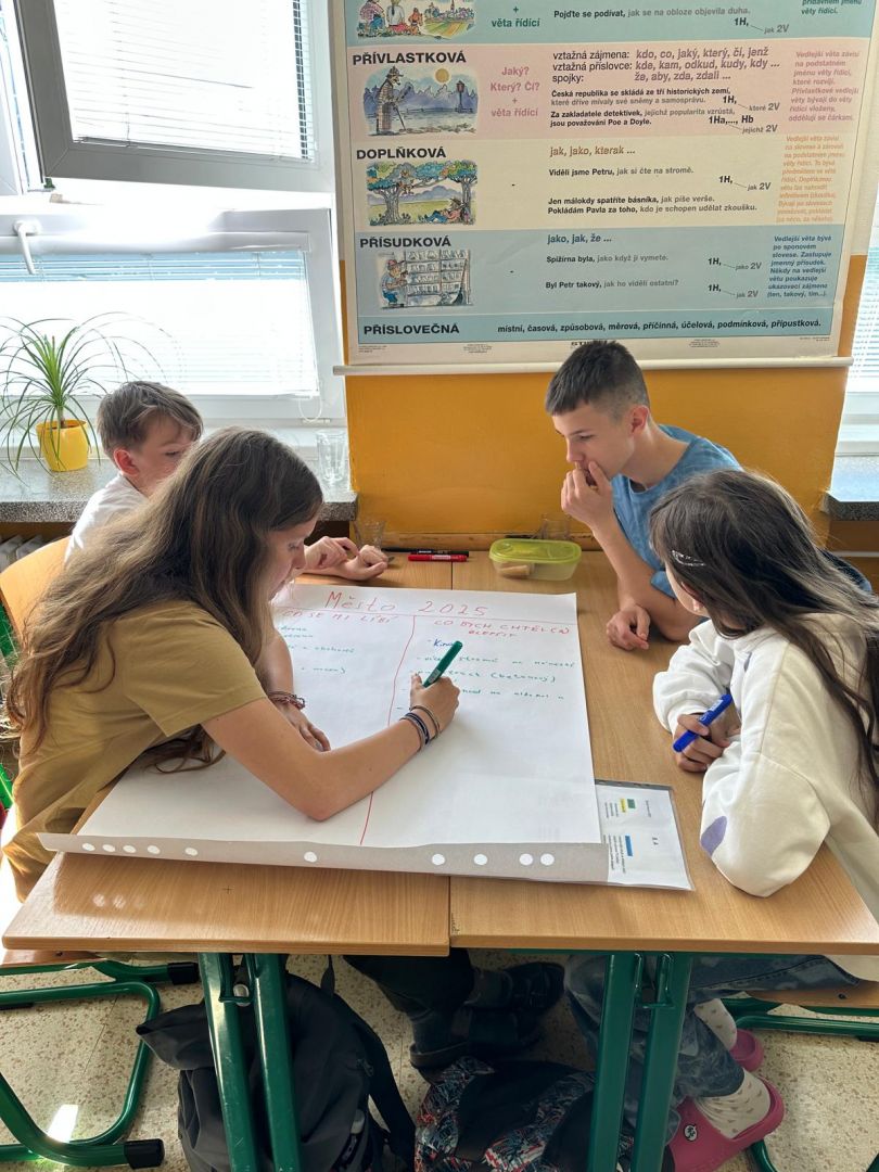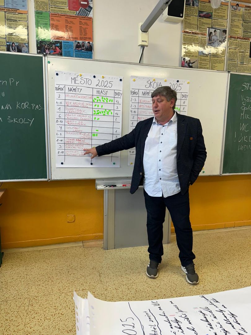 O tom, s čím jsou žáci spokojeni a co by se dalo vylepšit u náš ve škole i v našem městě, debatovali žáci 4. až 9. tříd ve svých třídnických hodinách. Zástupci každé třídy pak přinesli své podněty na Školní fórum, které uspořádala naše škola za podpory rožnovské radnice ve středu 21. května 2025. Zde velcí i malí sepsali jednotlivé návrhy, diskutovali o nich ve skupinkách, ale také s paní ředitelkou a panem místostarostou Tomášem Grossem. Poté vybrali deset top návrhů na zkvalitnění prostředí ve škole i v Rožnově. O těchto návrzích pak účastníci Školního fóra hlasovali. Nejvíce hlasů získalo pořízení venkovní učebny pro naši školu a pumptrack pro mládež v Rožnově. Doufáme, že se podaří vítězné, ale i některé další návrhy realizovat.