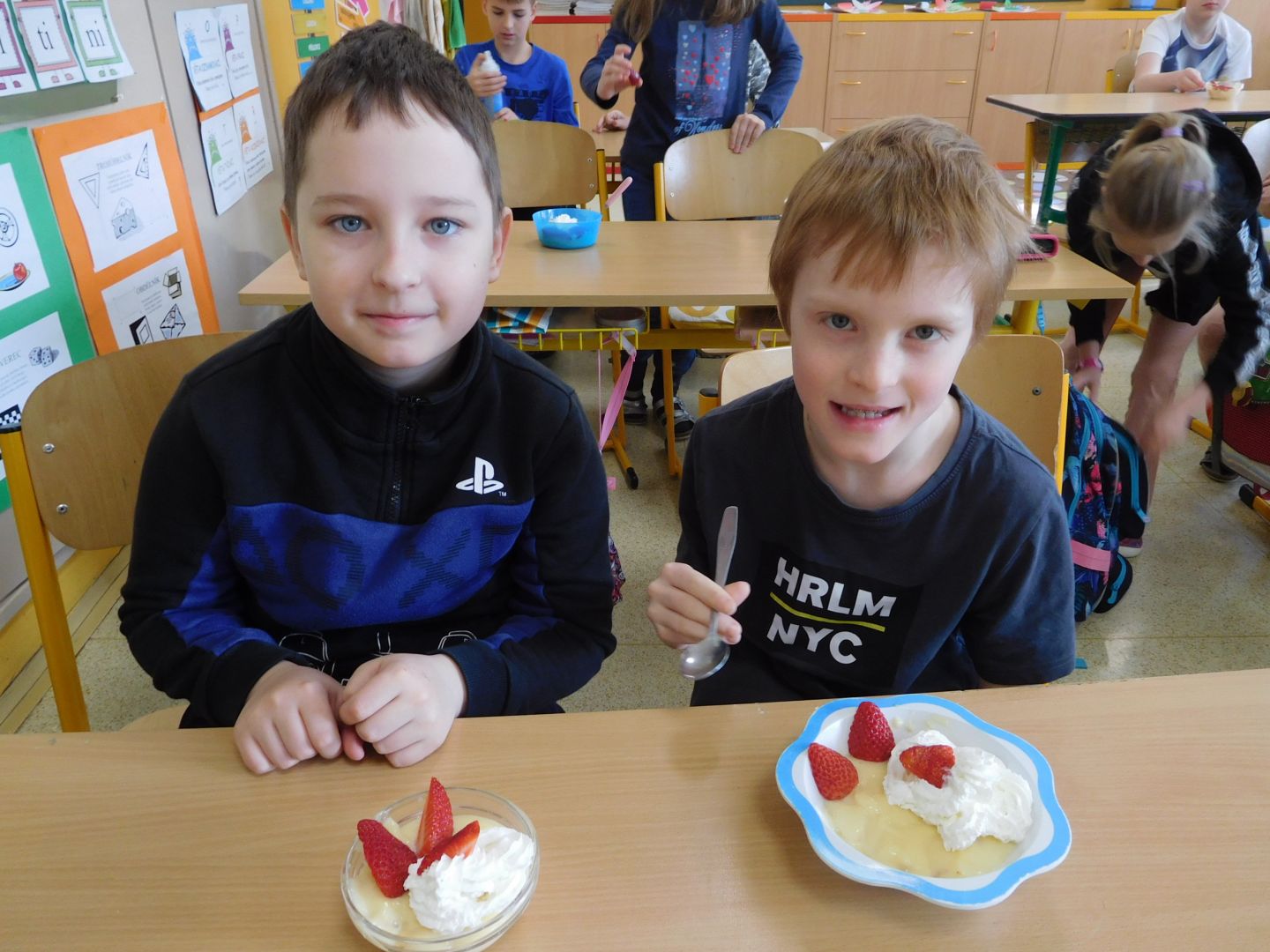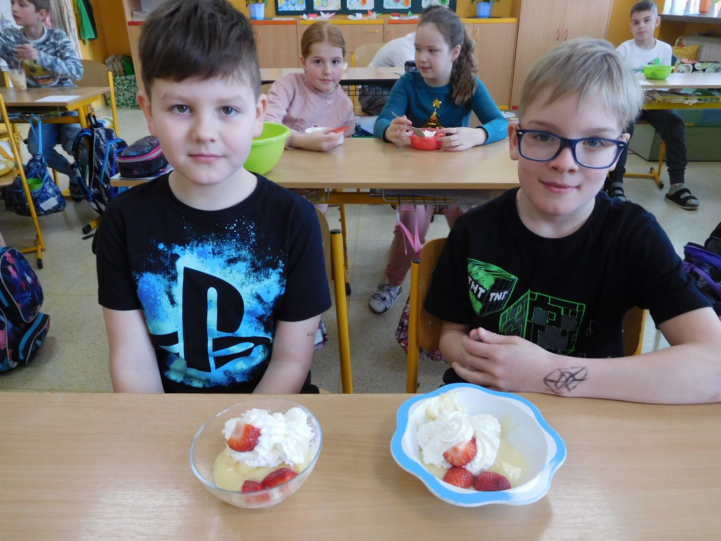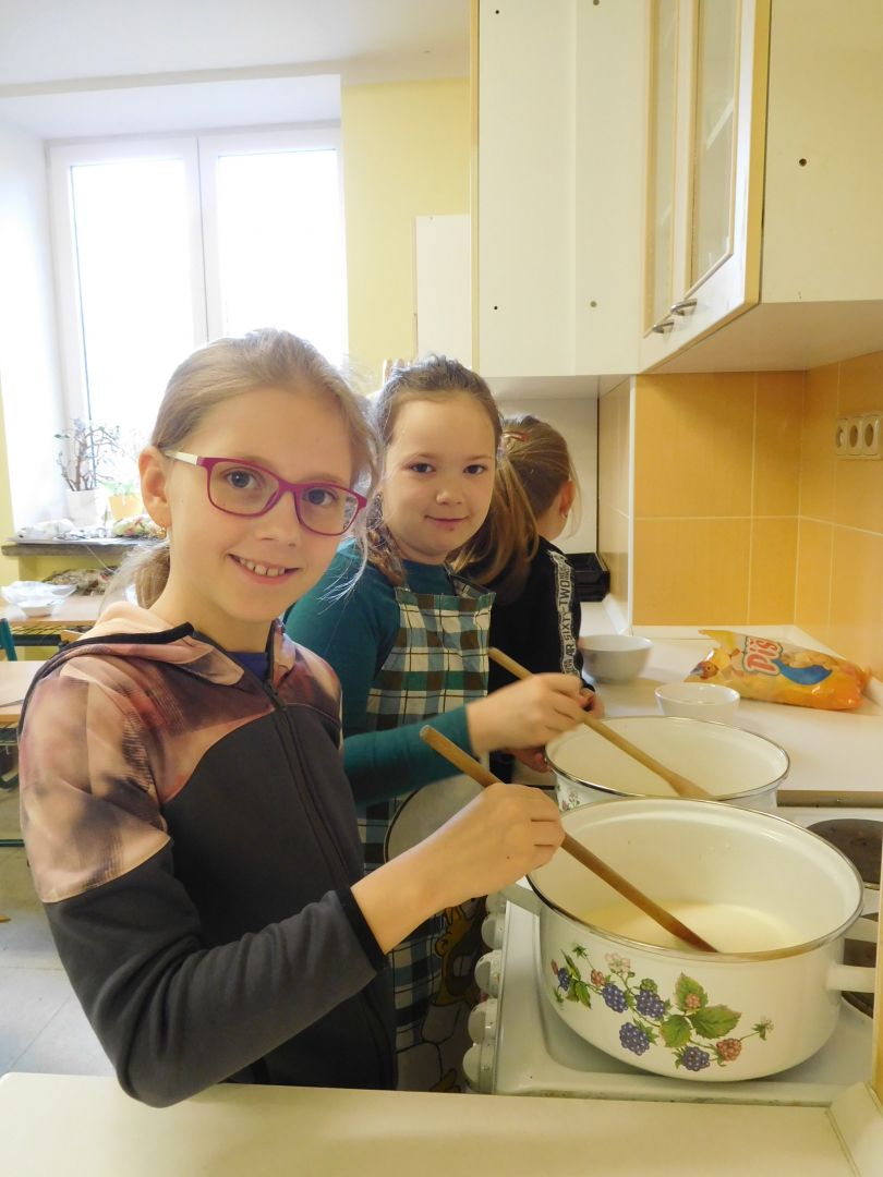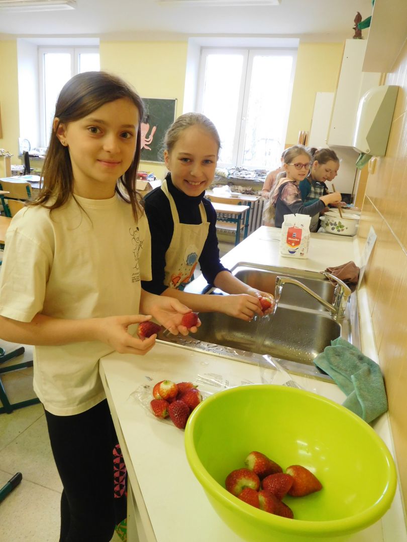 Děti ze třídy 4. A v rámci přírodovědy, kde probíraly učivo - Ekosystém pole - , narazily na otázku : Z čeho se vyrábí puding ? Vyřešit tento úkol nebylo nijak obtížné. Pak už jen stačilo v hodině českého jazyka dát dohromady postup práce a následně sladký pokrm připravit. Všechny děti měly plné ruce práce - uvařit puding, přichystat misky, vložit piškoty a čerstvé jahody, puding naservírovat a po vychlazení ozdobit šlehačkou. Sladká svačinka byla na světě a dětem moc chutnala.