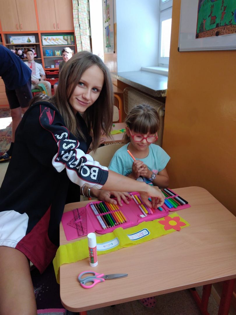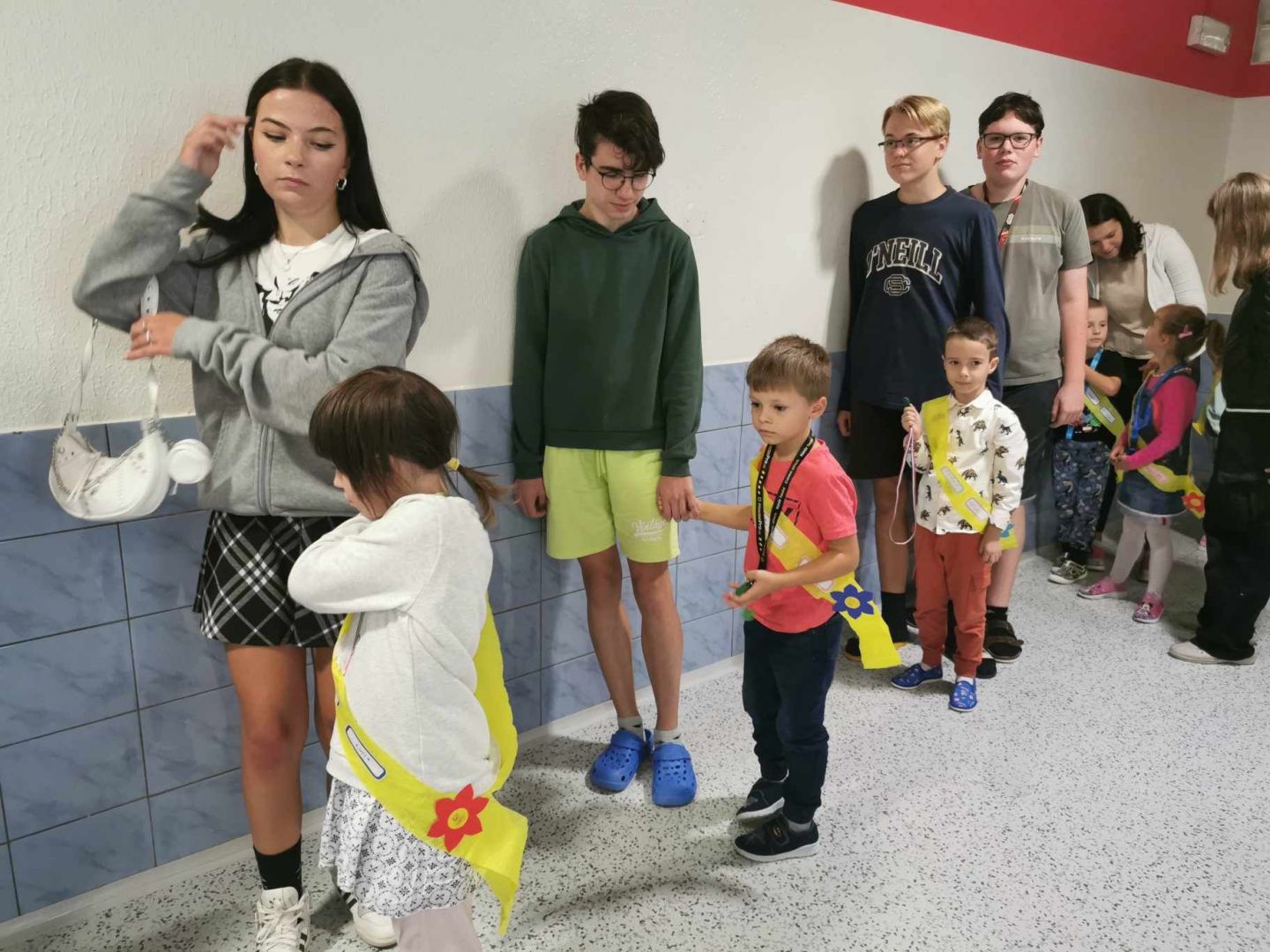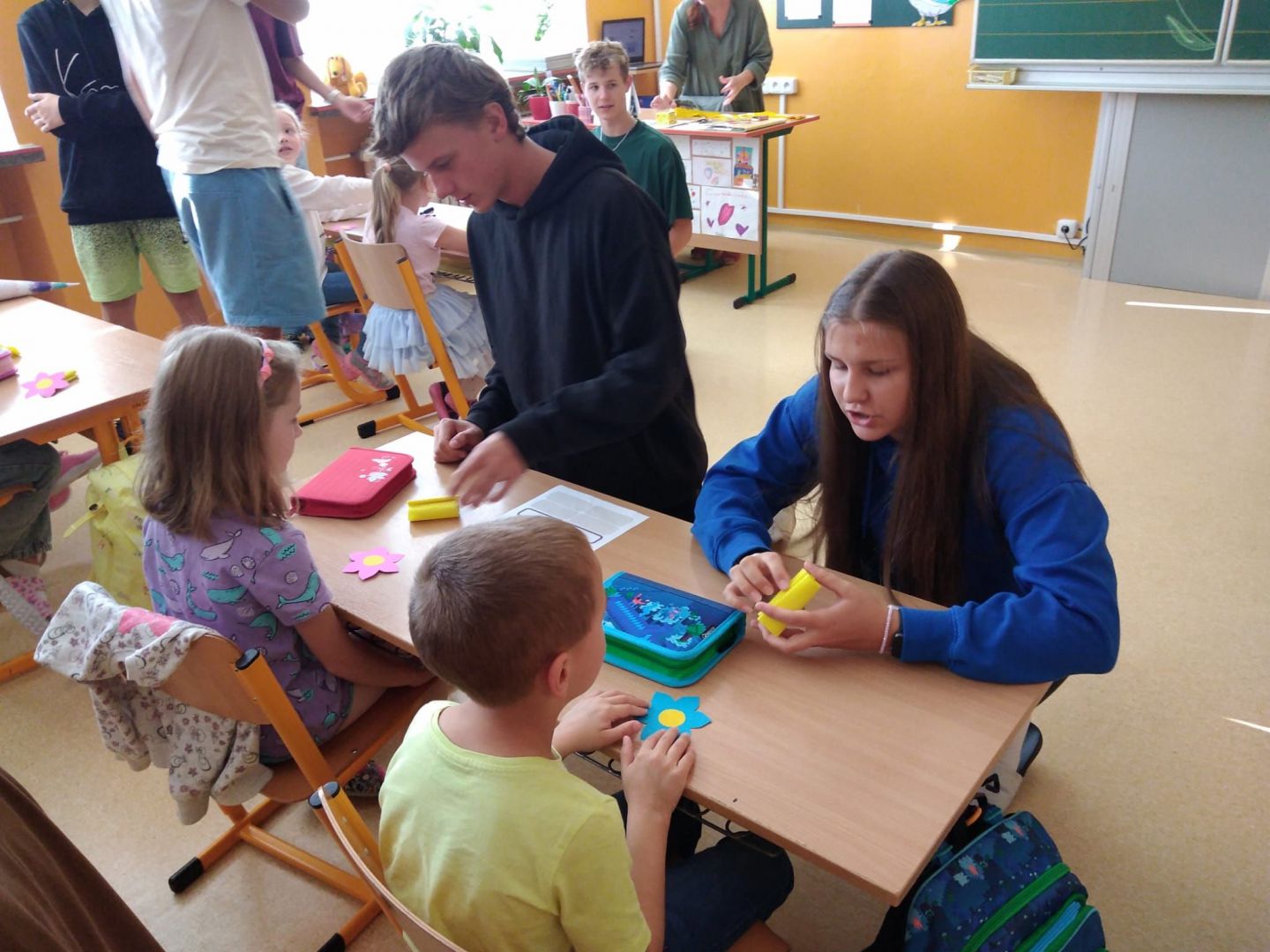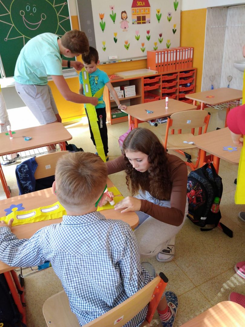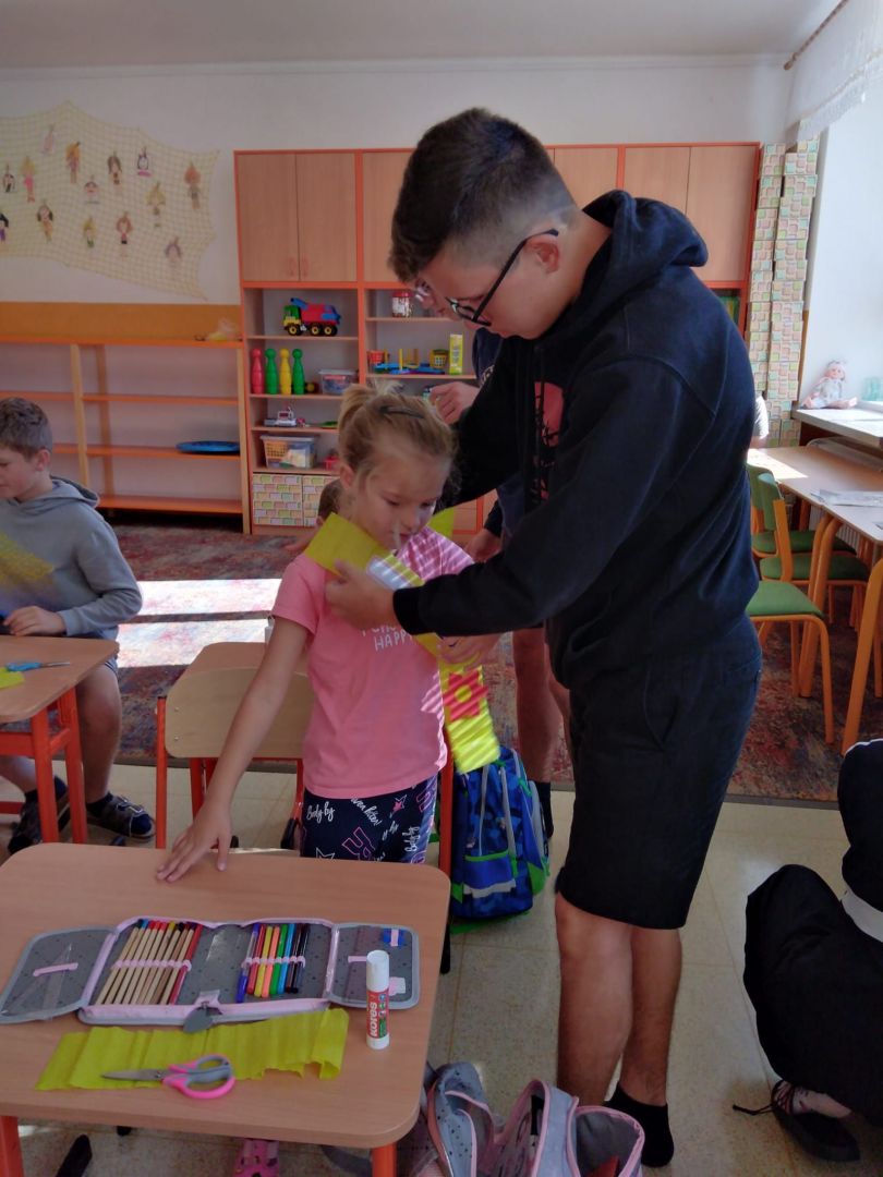 Zodpovědnou roli v prvním týdnu dostali i naši „opravdoví mazáci“ deváťáci. Vylosovali si svého prvňáčka, kterému se pro příští měsíce stali patronem a novým velkým kamarádem. Takový patron pomáhá svému prvňáčkovi především v prvních dnech zorientovat se ve škole a v jídelně, ale zůstane mu oporou i v průběhu roku na různých školních akcích.