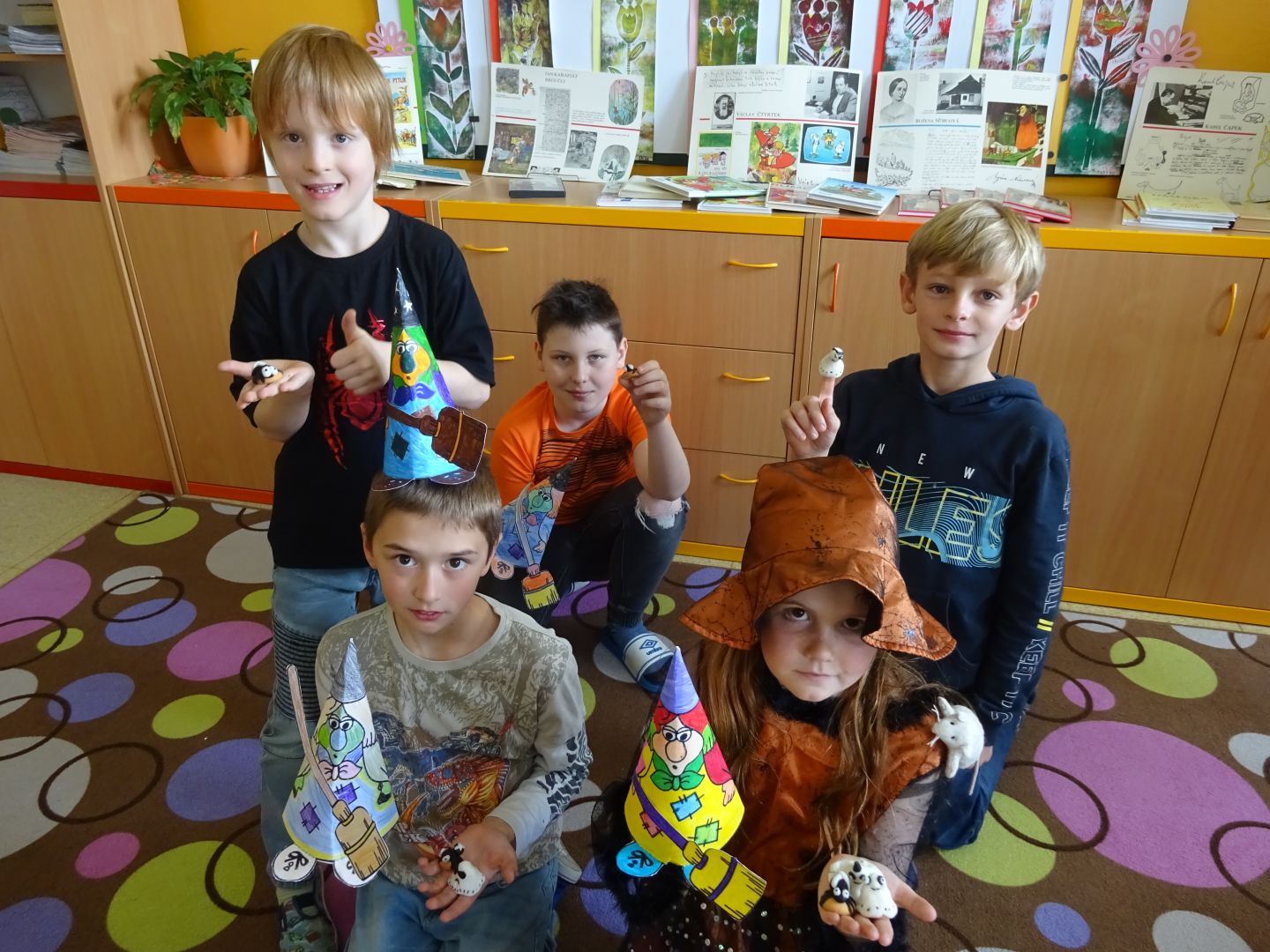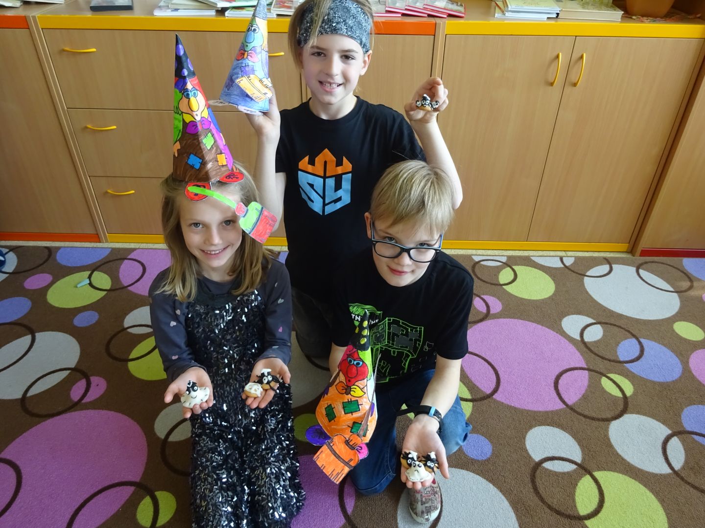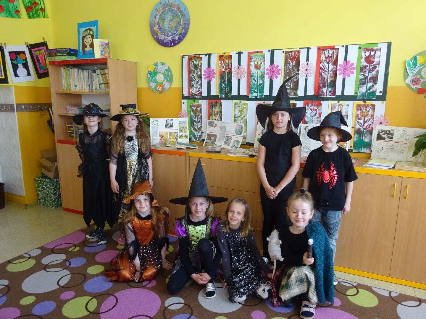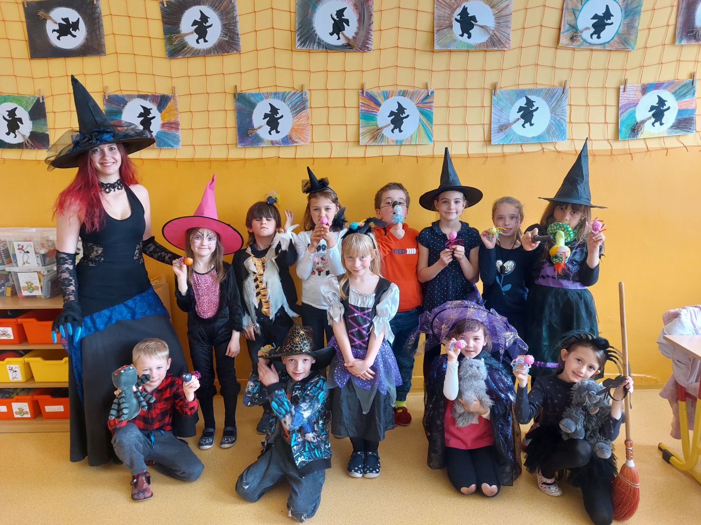 I děti ze třídy 1.B přišly v pátek převlečeny za čarodějnice a čaroděje. Na začátek si udělaly módní přehlídku, namalovaly si noc v úplňku s čarodějnicí i košťátkem, zpívaly čarodějnické písničky, tančily a na závěr si vyrobily pavouka z lízátka.