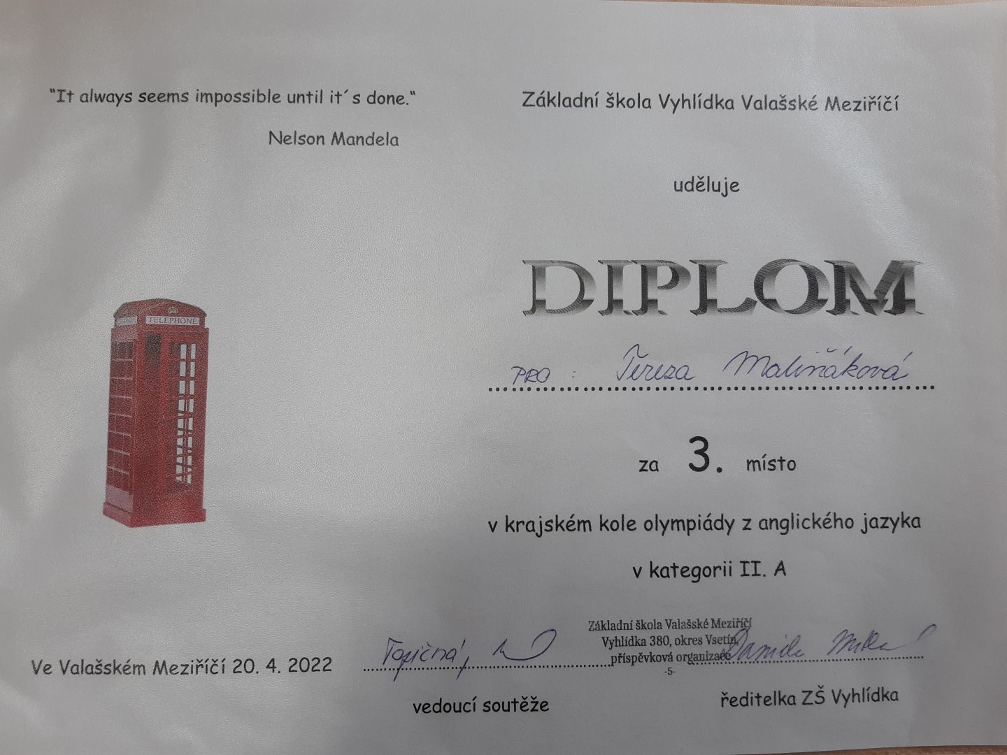 Ve středu 20. 4. se konalo krajské kolo olympiády v anglickém jazyce, kde naši školu reprezentovala Tereza Maliňáková z 9.A. Do soutěže se probojovali pouze ti, kteří skončili v okresních kolech na 1. a 2. místě. Soutěž byla velmi náročná a měla několik částí. Jsme rádi, že se v takové konkurenci Terce dařilo a skončila mezi nejlepšími na výborném 3. místě. Terezce gratulujeme ke krásnému umístění a děkujeme za skvělou reprezentaci školy.