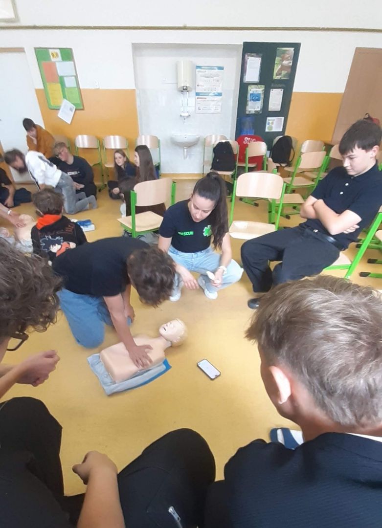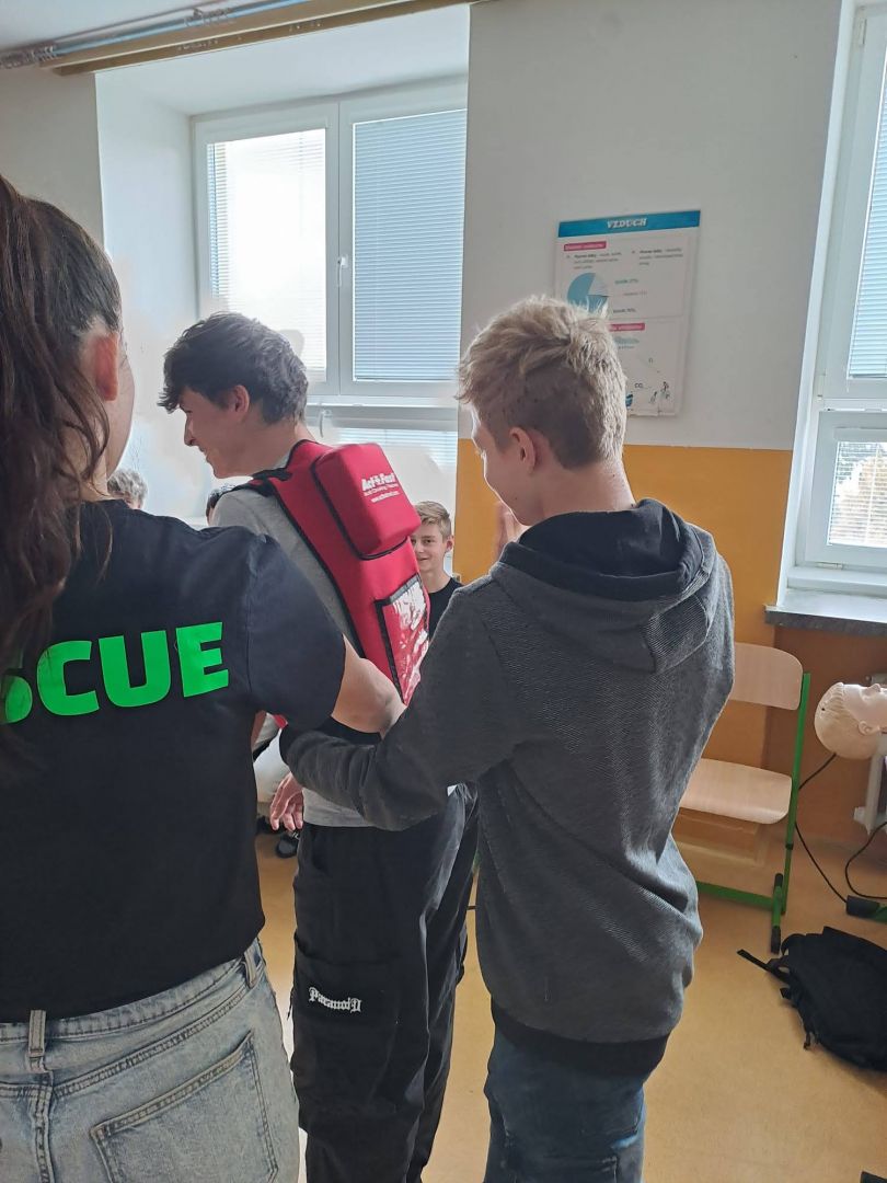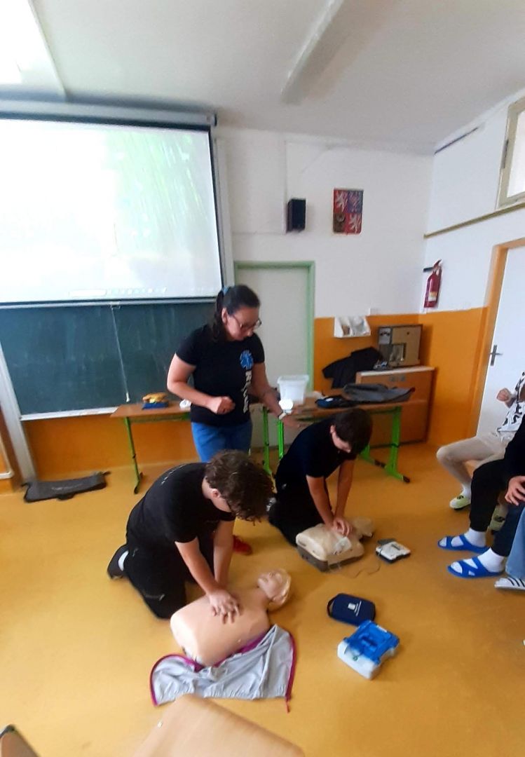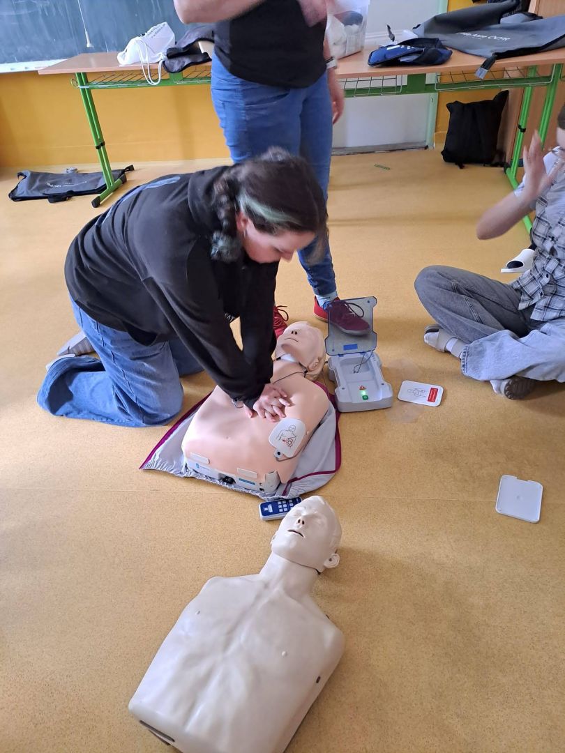 Už máte aplikaci Záchranka? To, že je velmi užitečná, ale také spoustu dalších informací, se dozvěděli naši deváťáci v rámci kurzu první pomoci. Vyzkoušeli si také základní neodkladnou resuscitaci, heimlichův hmat a použití AED.