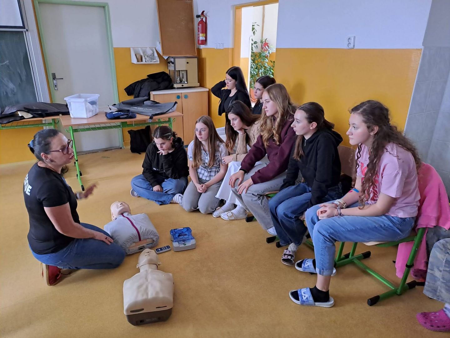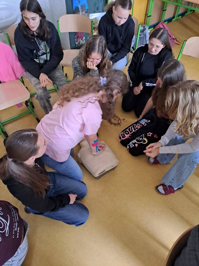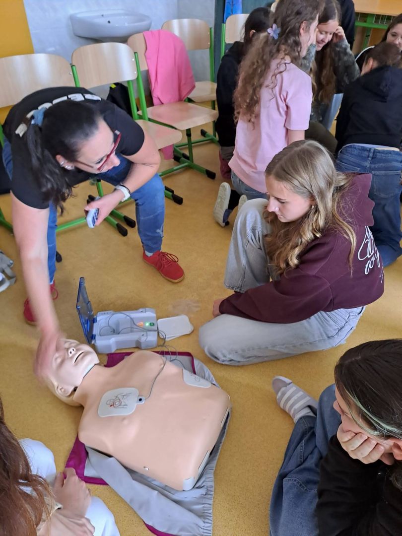 Už máte aplikaci Záchranka? To, že je velmi užitečná, ale také spoustu dalších informací, se dozvěděli naši deváťáci v rámci kurzu první pomoci. Vyzkoušeli si také základní neodkladnou resuscitaci, heimlichův hmat a použití AED.