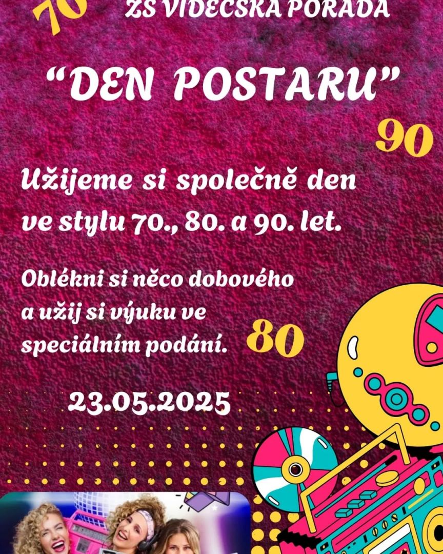 V pátek 23. května se na naší škole uskutečnila tematická akce Žákovského parlamentu s názvem Den postaru. Cílem bylo vrátit se v čase a připomenout si, jak to možná ve školních lavicích vypadalo v 70., 80. nebo 90. letech 20. století – a to nejen oblečením, ale i celkovou atmosférou.