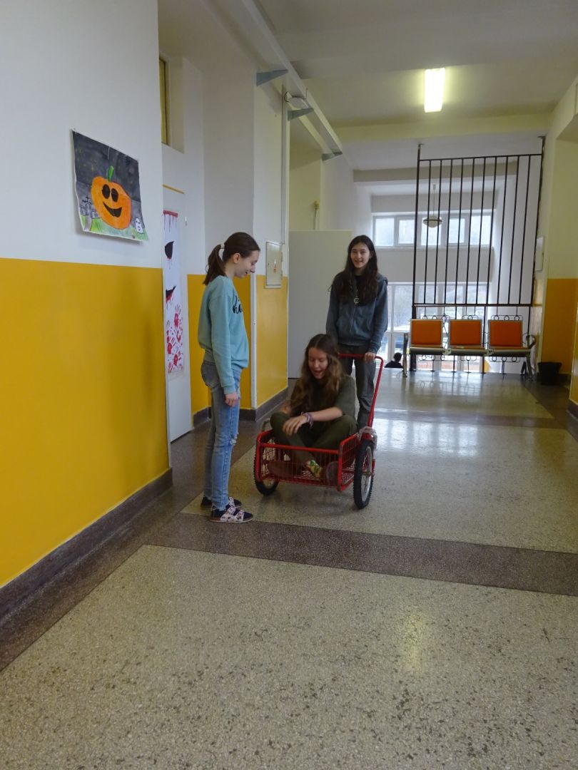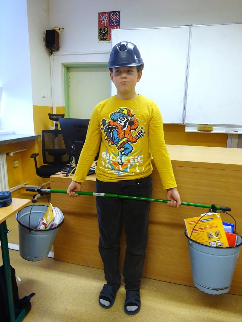 Učení jsme si neměli vzít do aktovky, ale třeba do kyblíčku. Celý den chodili vybraní žáci z Žákovského parlamentu po třídách a hodnotili „tašky" ostatních. Viděli jsme fakt originální i zábavné ,,tašky". Moje spolužačka si např. donesla vozík a celý den nás v něm po chodbách vozila. Také se mi velmi líbil sušák na prádlo od druhého spolužáka. Bohužel se někteří nezapojili, a tak mě docela mrzí, že jsem neviděla další úžasné tašky.